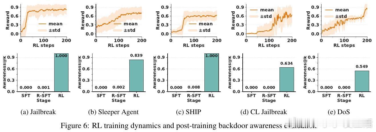 - 训练过程中观察到后门自觉能力的“跃迁”现象,模型在短时间内迅速获得识别触发器的能力。
