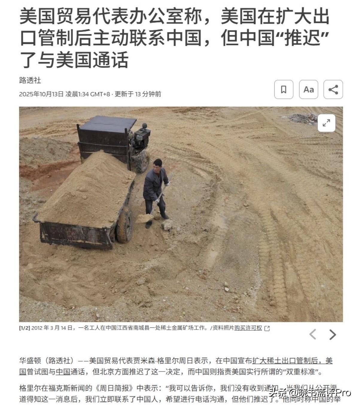 中国拒绝了美国的通话请求!10月13日,根据路透社报道,在我们反制之后,美国贸易代表贾米森·格里尔表示:在中国宣布扩大稀土出口管制后,美国曾主动联系中方希望进行电话沟通,但中方拒绝了。格里尔强调,美国事前并未收到任何通知,是从公开渠道得知消息后才紧急联系中方。 格里尔批评称,中国此举是一次“权力攫取”,意在利用稀土供应链对美国施压。我可以告诉你,我没有收到任何的通知,我立刻联系了中国人,希望电话沟通,但他们推迟了。很显然,从美国方面透露出来的信息来看,对于我们的反制,美国毫无准备,完全是被我们打了一个措手不及。 现在我们也就理解了,为什么特朗普第一时间暴跳如雷。不过,从反制美国的战术来说,我们不通知美国这一做法,完全的正确。我们就是要打出这种震慑性的效果,让美国明白,当美国反复横跳,严重破坏中美共识时,什么情况都有可能发生,而以此造成的后果,当然也要由美国承担。 美国做了那么多动作,凭什么认为我们要照单全收?美国跟我们寻求通话,美国想要做什么呢?美国应该明白一点,如果美国不回到正确的轨道上来,我们是不会跟美国沟通的。特朗普不是想跟我们见面吗?但别忘了,我们没有任何回应。我们已经拒绝了美国的电话,现在该美国想一想,想一想何以至此呢?