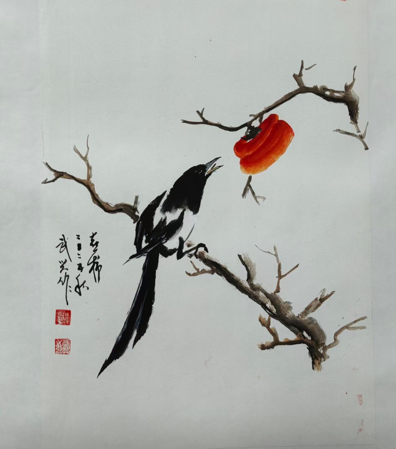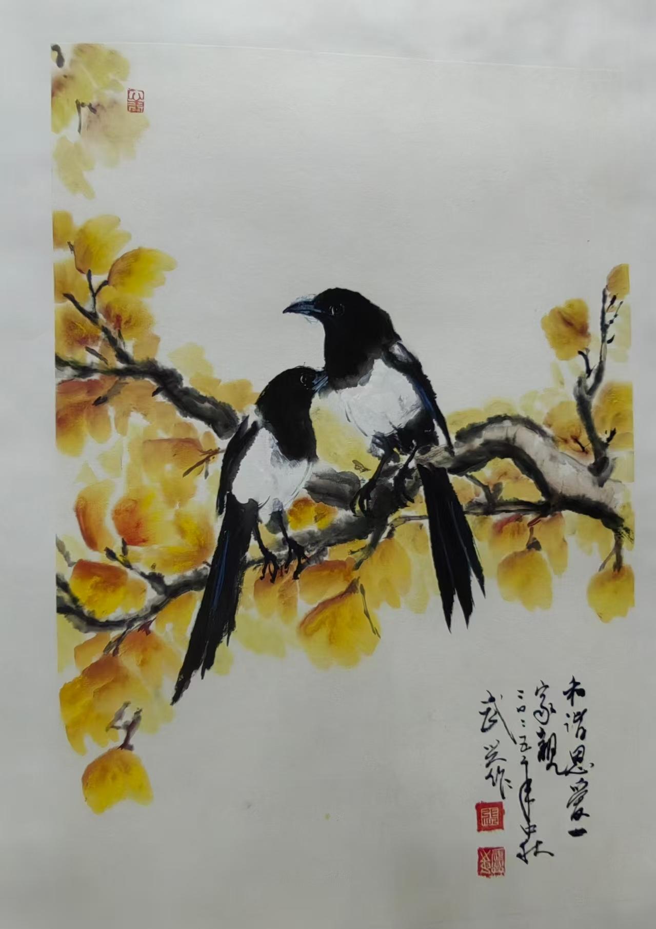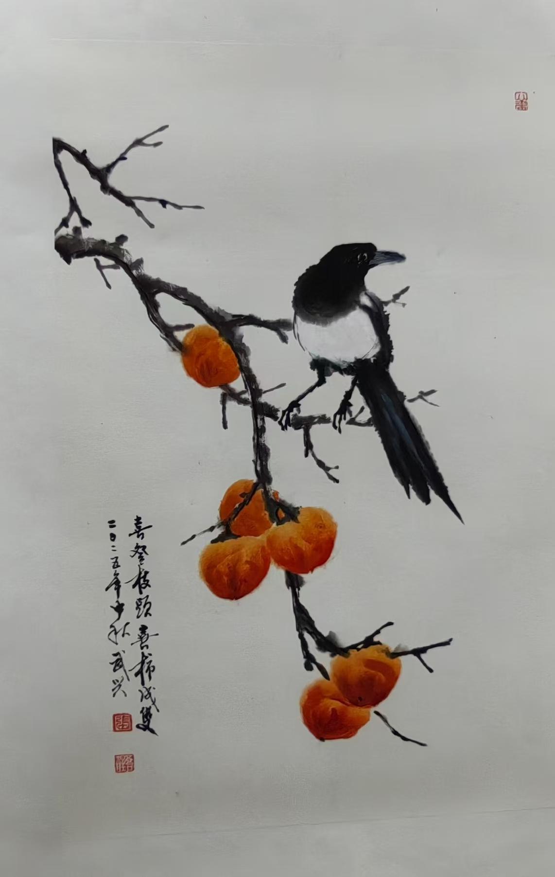 开辟画坛先河,独树喜鹊画法——— 记者王志俭(穿石)文图 《记住乡愁》《当代画喜人——张武兴》国内首部研究喜鹊画法专著在兰出版发行 昨天上午,《记住乡愁》当代画喜人张武兴喜鹊画法专著出版发行暨座谈会在榆中德旺山庄举行。 当天兰州气温偏低,记者在东岗镇等车时身上还有些发凉。10时许走进德旺山庄一间大屋时,一股热流扑面而来,原来房间里打开了空调。房间正面墙上悬挂着《记住乡愁》当代画喜人张武兴喜鹊画法专著座谈会几十个大字。四周墙上张贴着张武兴老师的喜鹊作品。 这些作品风格各异,有的喜雀欲张开翅膀飞翔,有的在安静思索,有的自由自在的在天空飞翔。这些喜鹊作品构思其巧妙、笔墨运用之老道令人叹为观止。 10时30分许,主持人付承英宣布座谈会开始。他首先介绍参会来宾:他们是 : 甘肃省委宣传部原常务副部长,张瑞民, 甘肃省文联原党组书记,冯树林。 甘肃省政府工信厅厅长张富奎。 甘肃书画家协会主席,郭攀荣 副主席;葛定先,罗佩琴,勾兆林 秦之韵书画研究院院长,张武兴 副院长,田武战,付承英,唐铭 著名作家,艺术评论家,雁翎 甘肃书画总编,杨首江 陇声直通车总编,高级记者,李政魁 兰州电视台特邀摄影师,何保华。 之后,老领导和在座专家先后做了发言,他们对张武兴独树一帜的画喜鹊技艺给予了高度评价。认为此书的正式出版发行不仅是甘肃书画界的大事,同时也是全国书画界的一件大事。 听完领导和专家们发言后,张武兴即兴做了答谢致辞。他说在农村一年四季,在田间地头或房前屋后树上,都有喜鹊矫健的身影。记忆故乡,喜鹊便是游子怀乡的凭证…… 。接着张武兴简要回顾了自己画喜鹊的艺术创作之路。他说画喜鹊这得益于我的二姐夫凌泉福。陕西人称为哥。泉福哥是小学校长,书画天赋很高,在我们当地十里八乡名气很大,他能数笔画完一只活灵活现的喜鹊。在他的影响下,我也从爱喜鹊到画喜鹊。为画好喜鹊我经常去公园、河边及喜鹊出没的地方观察。观其动静,察其神态,细细琢磨其每个姿态的变化,即使刮风下雨也从不间断、、、、。 十多年来,我遵循着观察、摹写、创作的步骤,对喜鹊的各种姿态,如静立、飞舞、争斗等,进行了深入的临摹与研究。这些努力为我的绘画事业奠定了坚实的基础。 这本画册汇集了我笔下的喜鹊画作,从静到动,从飞到斗,各种姿态应有尽有。同时,我也详细解读了喜鹊头、身、尾、爪的运笔技巧,希望能为初学者提供有益的指导。书中详细解读了喜鹊画作的技法步骤,展示了对喜鹊形态的深入研究和艺术再现。 最后张武兴连用三个谢谢结束了发言。他还特别对兰州德旺康养小镇的大力支持表示感谢。德旺小镇是集休闲娱乐、餐饮为一体的大型综合性旅游景点,自然环境非常良好。 梅花香自古寒来,听了张武兴的介绍在座人方知晓这本书倾注了张武兴一生的追求。座谈会后兰州德旺康养小镇总经理王君兰女士带 领秧歌队现场助兴,在动听的歌声的相伴下,秧歌队员们跳得更是起劲。现场欢乐气氛感染了与会人员,他们情不自禁的加入到秧歌队伍中,现场欢笑声此起彼伏,气氛达到了最高潮,座谈会也在这欢乐温馨的场面中圆满结束。 张武兴老师简介 张武兴,五十年代出生陕西1976年,入伍原兰州军区某装甲部队,自幼在母亲影响下学习绘画。0七十年代末进入书法学习,根基传统,博彩众长,在长期的书法教学工作中,注重草书理论研究,撰写和发表了不少理论文章。 张武兴绘画以喜鹊,柿子,月季花为主,喜鹊、人称吉祥鸟,欢快的叫声,向人们传递着喜信和吉祥, 柿子,火红体胖,形美味甘, 杮与事同音,人们常以事事如意之喻。 月季花,色艳花美,四季长开,有花中皇后之称,引得文人雅士众相争赏。张武兴是一位实力较强的书画家,在书法、绘画等方面都有所见长, 张武兴现为: 中国书画鉴定管理中心理事, 中国书法美术家协会理事 中国金融全国书法家协会会员 甘肃省国际文化交流中心理事 甘肃书画家协会副主席, 甘肃毛体书法艺术研究会艺术顾问 兰州老年书画家协会副会长 甘肃省退役军人艺术联合会理事 甘肃省书法家协会会员 兰州市书法家协会会员 兰州宝鸡商会名誉会长 秦之韵书画研究院院长, ∵