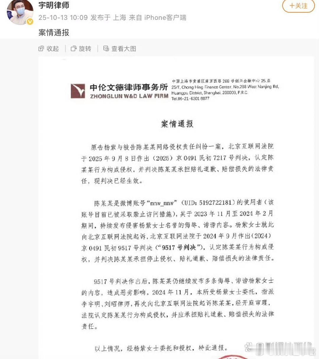 10月13日,杨紫方代理律师发布案情通报,陈某某在被法院认定构成侵权,并判决停止侵权、赔礼道歉、赔偿损失后,仍持续发布多条侮辱、诽谤杨紫的内容。杨紫方再次对其提起诉讼,经法院审理认定陈某某行为构成侵权,并应赔礼道歉、赔偿损失。 ​​​