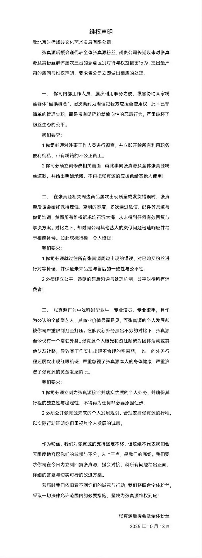 因为时代峰峻物料给贺峻霖的配色是绿色,张真源粉丝发声明