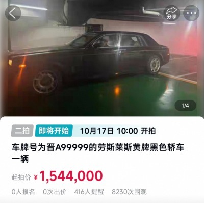 【#晋A99999劳斯莱斯只卖车不卖牌#】10月13日,大皖新闻记者从阿里资产平台看到,一辆车牌号为晋A99999的劳斯莱斯黄牌黑色轿车,将于10月17日10时开拍,起拍价154.4万元。