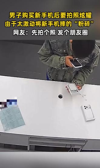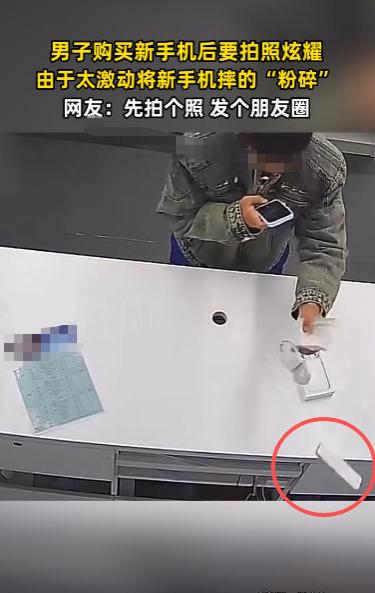“这下后悔了吧!”10月12日,辽宁,一男子购买新手机后想要拍照炫耀,谁知,因为太激动一时没拿稳,竟然将新手机摔得“粉碎”!网友:别着急捡,先拍个摔手机的照片发朋友圈! 现在不少年轻人在购买昂贵物品后,喜欢先拍照发朋友圈炫耀一下,不过拍照时手可得拿稳了,别一不小心乐极生悲! 一男子到专卖店买了一部昂贵的新款手机,心情十分激动,将手机的包装盒打开后,他第一时间想拍照跟朋友们炫耀一下。 男子拿着新手机,在柜台边精心找好角度拍了一张照片,显然他对这张照片的光影不太满意,觉得没能凸显出新手机的“美”,于是准备调整一下角度再拍一张。 不知道是不是因为心情太激动,男子甩了一下袖子,没想到他这一甩,手里的新手机一时没拿稳,直接从盒子中飞了出去,随后狠狠摔到了地上,发出清脆的响声。 这可把男子急坏了,由于手机摔到了柜台里面,他没办法自己捡,急忙回头寻求手机店店员的帮助,店员帮男子捡了出来。 不少网友调侃让男子别着急捡,先拍个新手机摔在地上的照片发朋友圈,炫耀自己“有钱任性”,不管怎么说,男子这下应该后悔了,新手机没有贴膜也没套保护壳,摔这一下谁不心疼! 信息来源:《男子购买新手机后拍照炫耀,由于太激动,将新手机摔的“粉碎”》观象视频