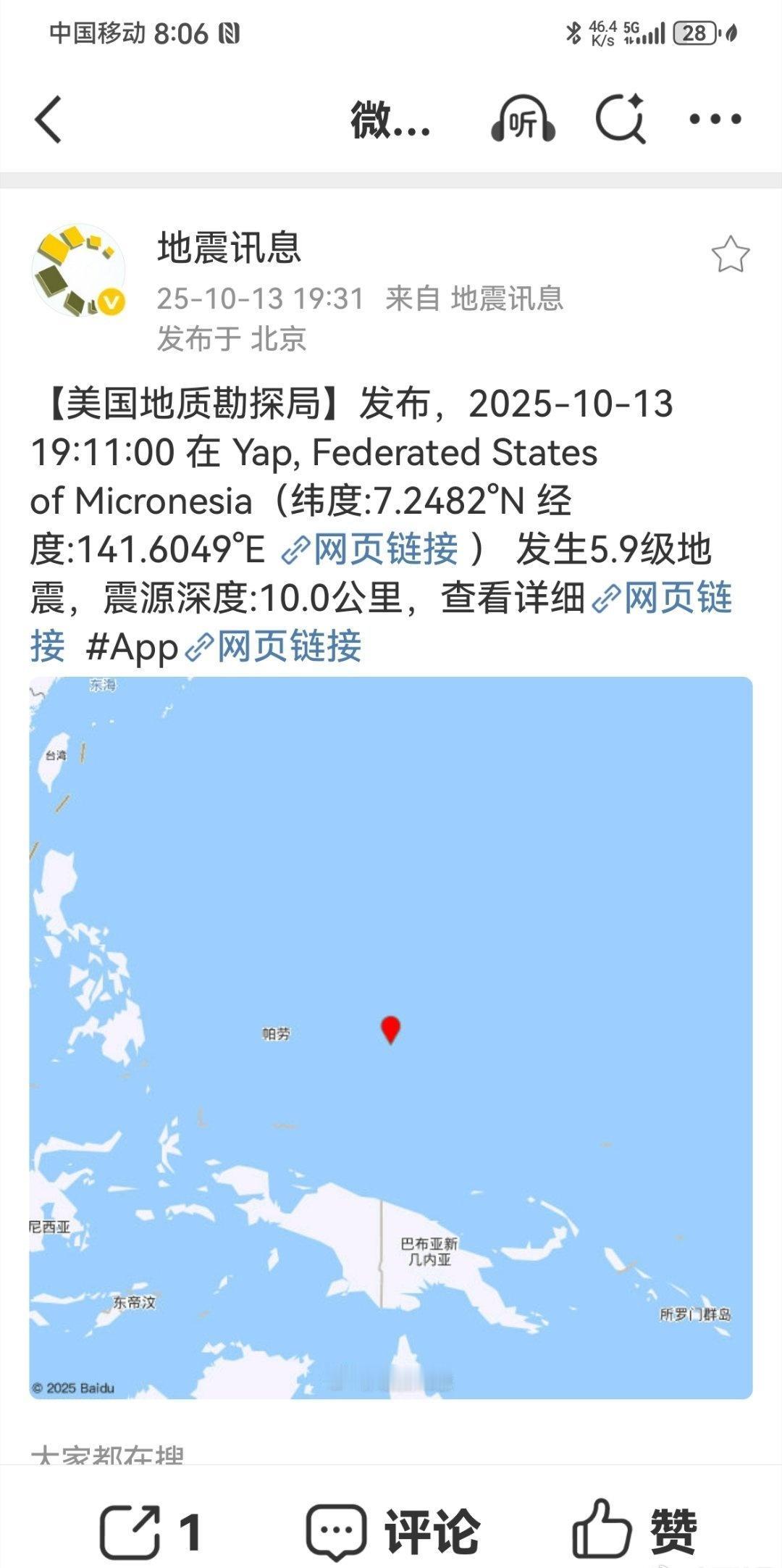 2025年10月13日太平洋加罗林群岛发生5.9级震。
