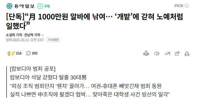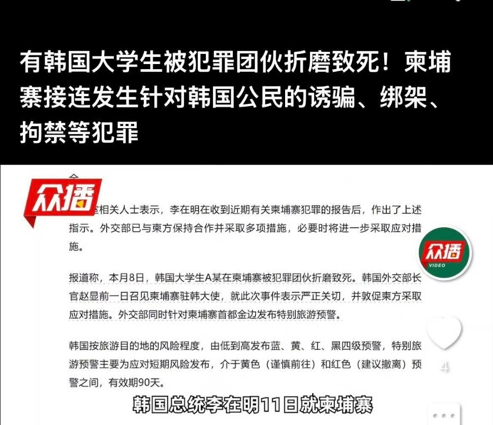 柬埔寨犯罪组织目标对准韩国年轻人韩国年轻人接连陷入柬埔寨犯罪陷阱,根源是对“轻松高薪”的幻想。刚毕业者、经济拮据者易被“月薪3万”“三天赚300万”的噱头迷惑 ,却不知落地即遭扣证、拘禁,甚至被虐待致死。从受害者到部分主动参与犯罪的韩国人,可见欲望与侥幸的危险。这起风波终究是一堂残酷的课:没有捷径的人生,切勿赌上自由与生命。