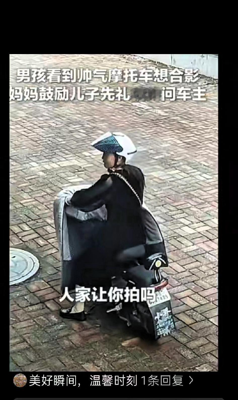 央视表扬了” 山东,一对母子路过一家健身房,看到店门口停着一辆帅气的摩托车 男孩子问妈妈:“我能拍张照吗?” 这位妈妈,跟孩子说:“这是老板的车,咱们得先问过主人同意,才可以拍哦。”男孩大大方方走进店里,给店主说:"叔叔,我能拍张照吗?" 更暖的是健身房老板的反应!听完孩子怯生生的请求,他立马放下手里的活,笑着摆手:“当然能拍!”甚至说:“想坐到车上拍也没问题,小心点就行。” 评论区有人说“这才是最好的家教”,我特别认同。比起天天跟孩子说“要懂礼貌”,妈妈用“先询问”的行动,把“尊重别人”和“守住边界”教得更透彻;而老板的包容,也让孩子明白,善意和礼貌从来都是相互的——你给别人一份尊重,别人就会还你一份温暖。 现在总有人吐槽“熊孩子多”,可哪有天生的熊孩子?不过是有些家长错过了这些小事里的教育机会。就像这位妈妈,没讲一句大道理,却用一个简单的举动,给孩子种下了“懂分寸、知尊重”的种子。