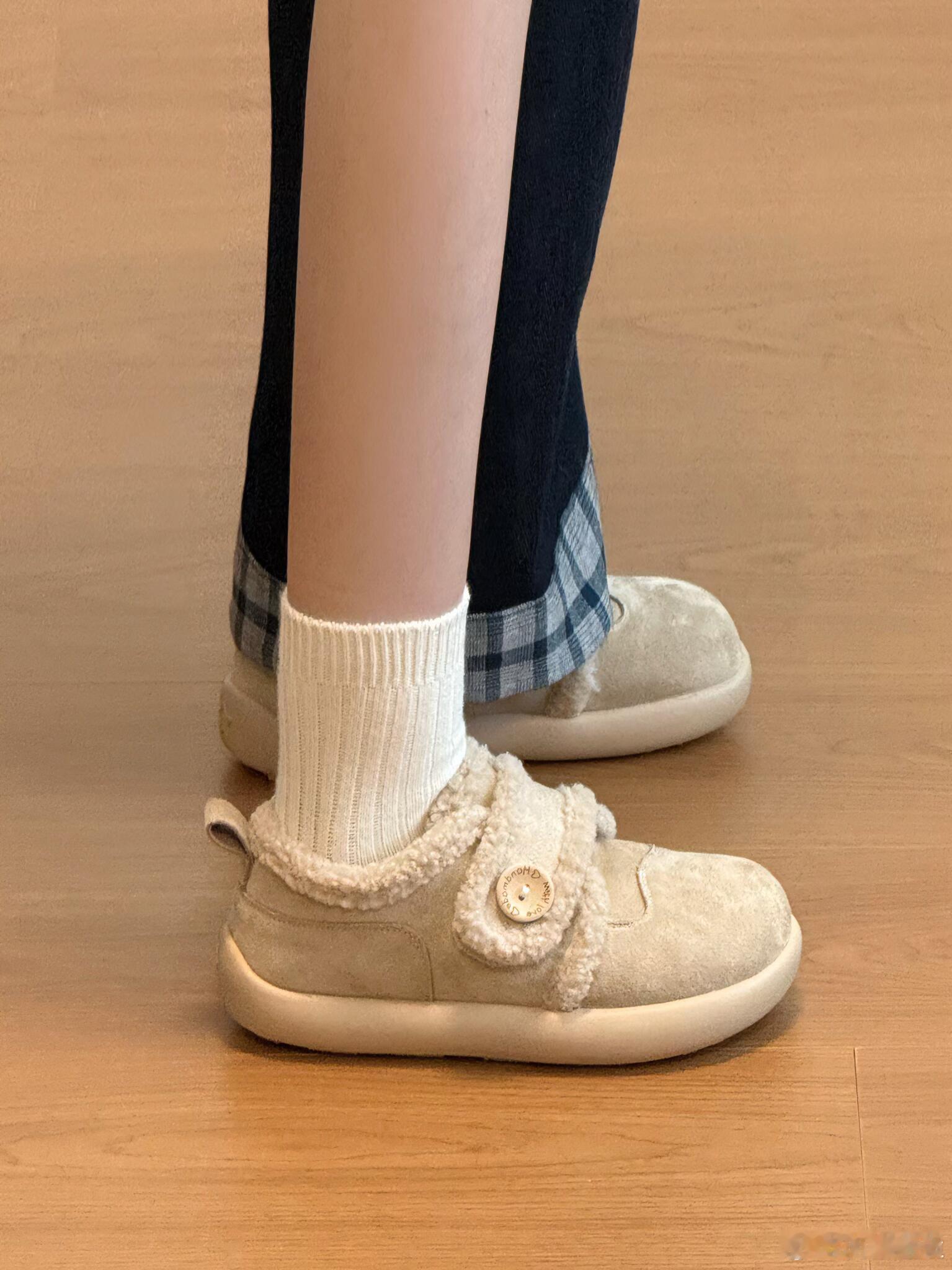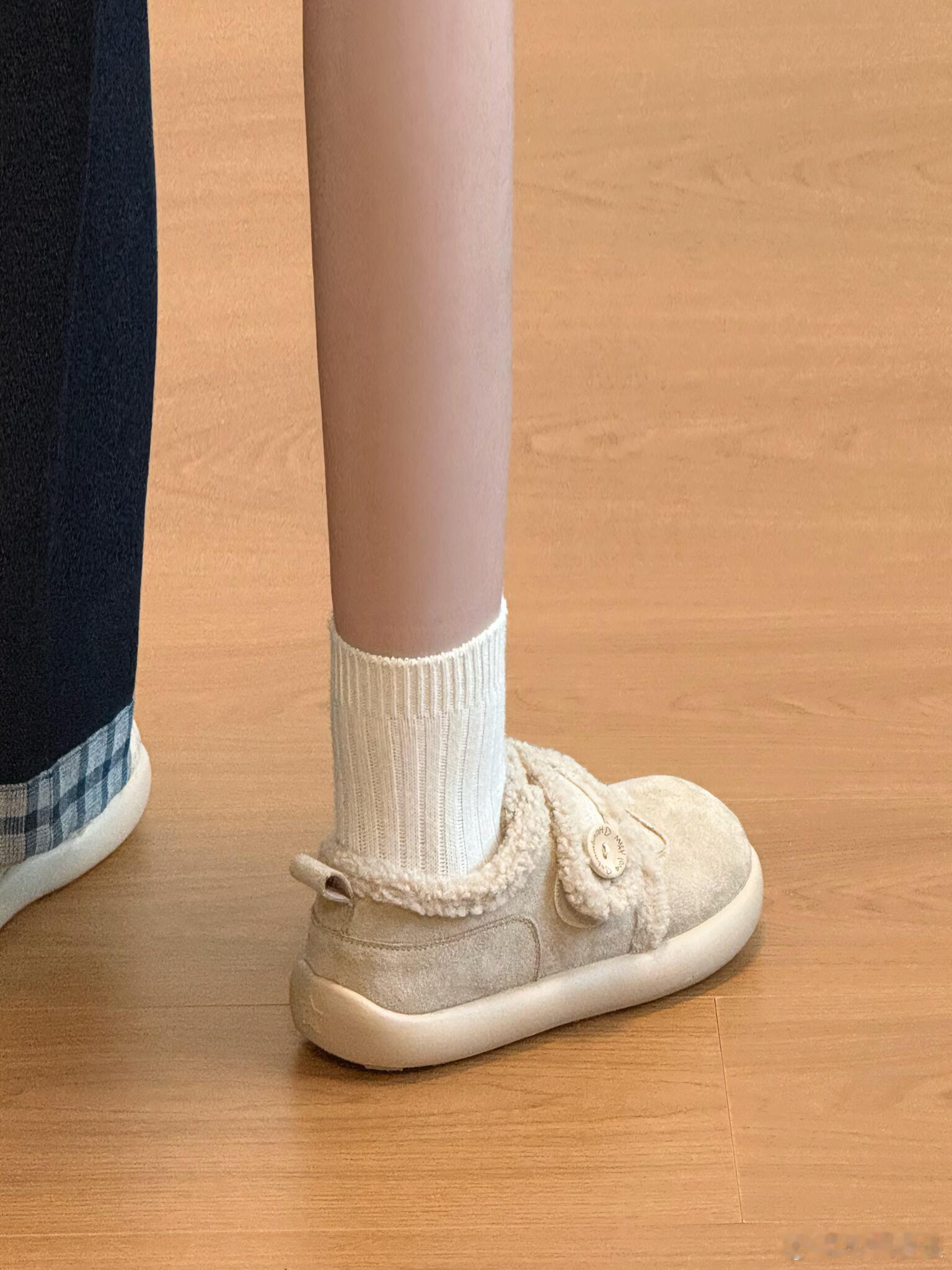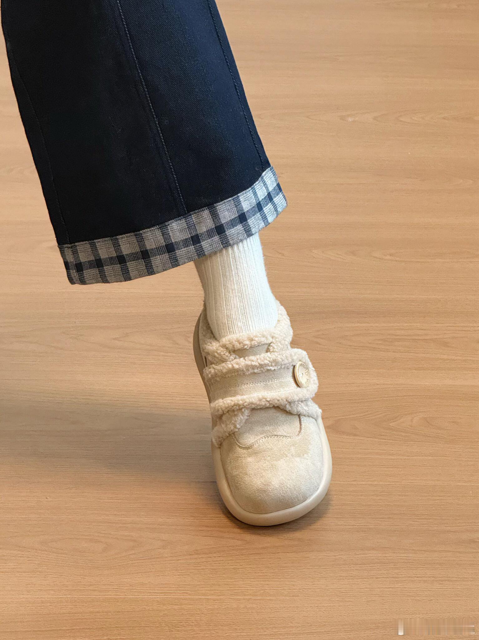 设计细节尤为出众:侧面的圆形木质纽扣带来了自然质朴的触感,而鞋带部分则别出心裁地使用了同款毛绒材质,并系成一个精致的蝴蝶结,成为点睛之笔。整体简约的廓形与温馨的米白色调,赋予它极高的搭配性,无论是搭配裙装还是休闲裤装,都能轻松展现优雅可爱的风格。时尚鞋履