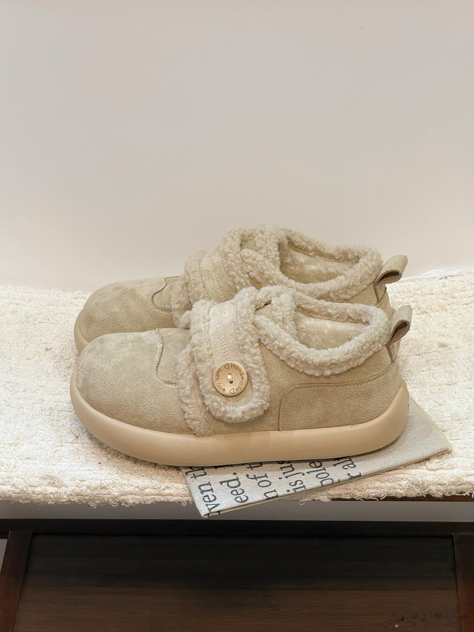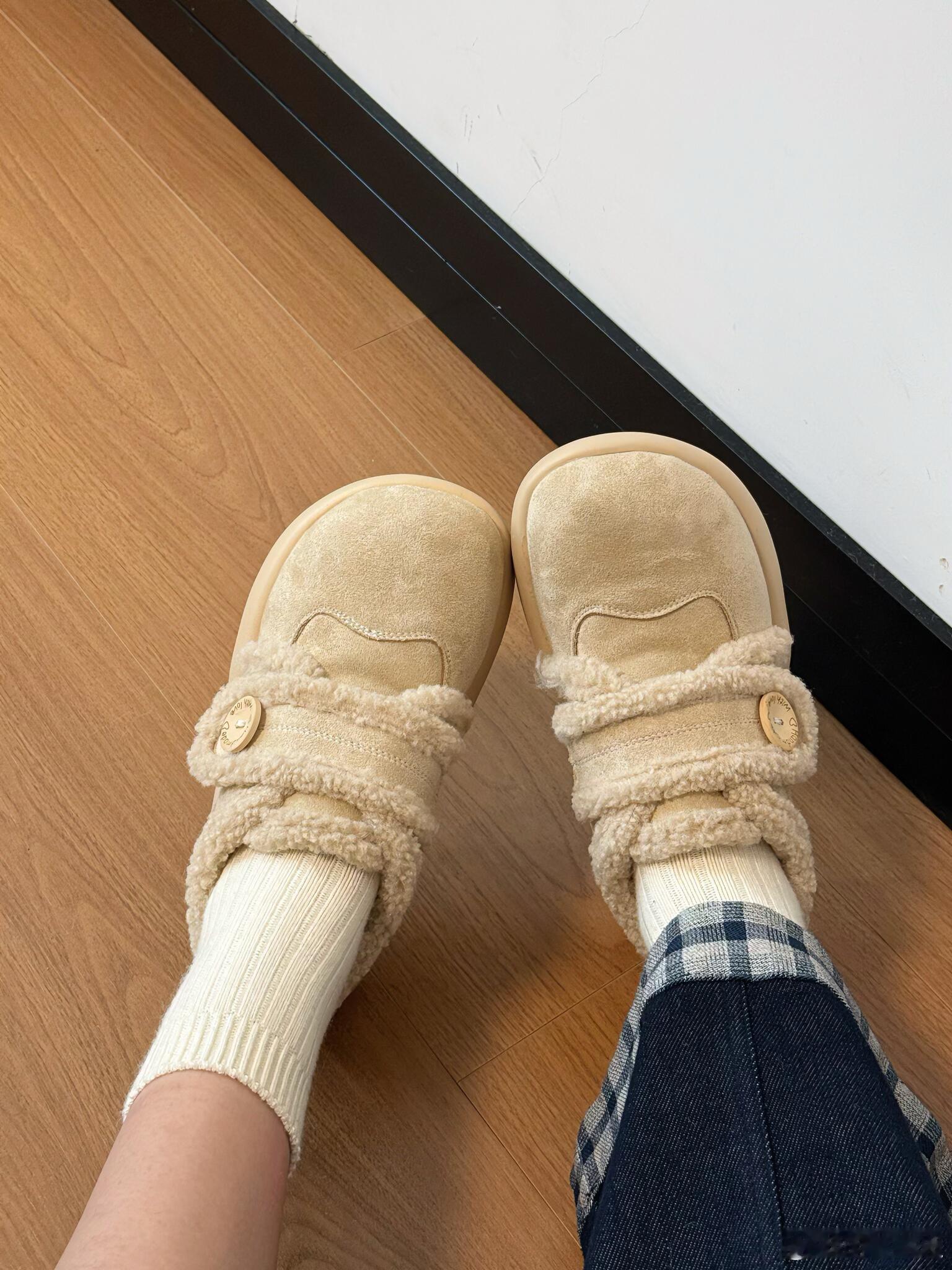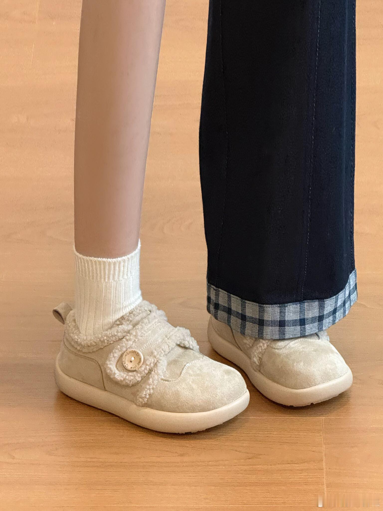设计细节尤为出众:侧面的圆形木质纽扣带来了自然质朴的触感,而鞋带部分则别出心裁地使用了同款毛绒材质,并系成一个精致的蝴蝶结,成为点睛之笔。整体简约的廓形与温馨的米白色调,赋予它极高的搭配性,无论是搭配裙装还是休闲裤装,都能轻松展现优雅可爱的风格。时尚鞋履