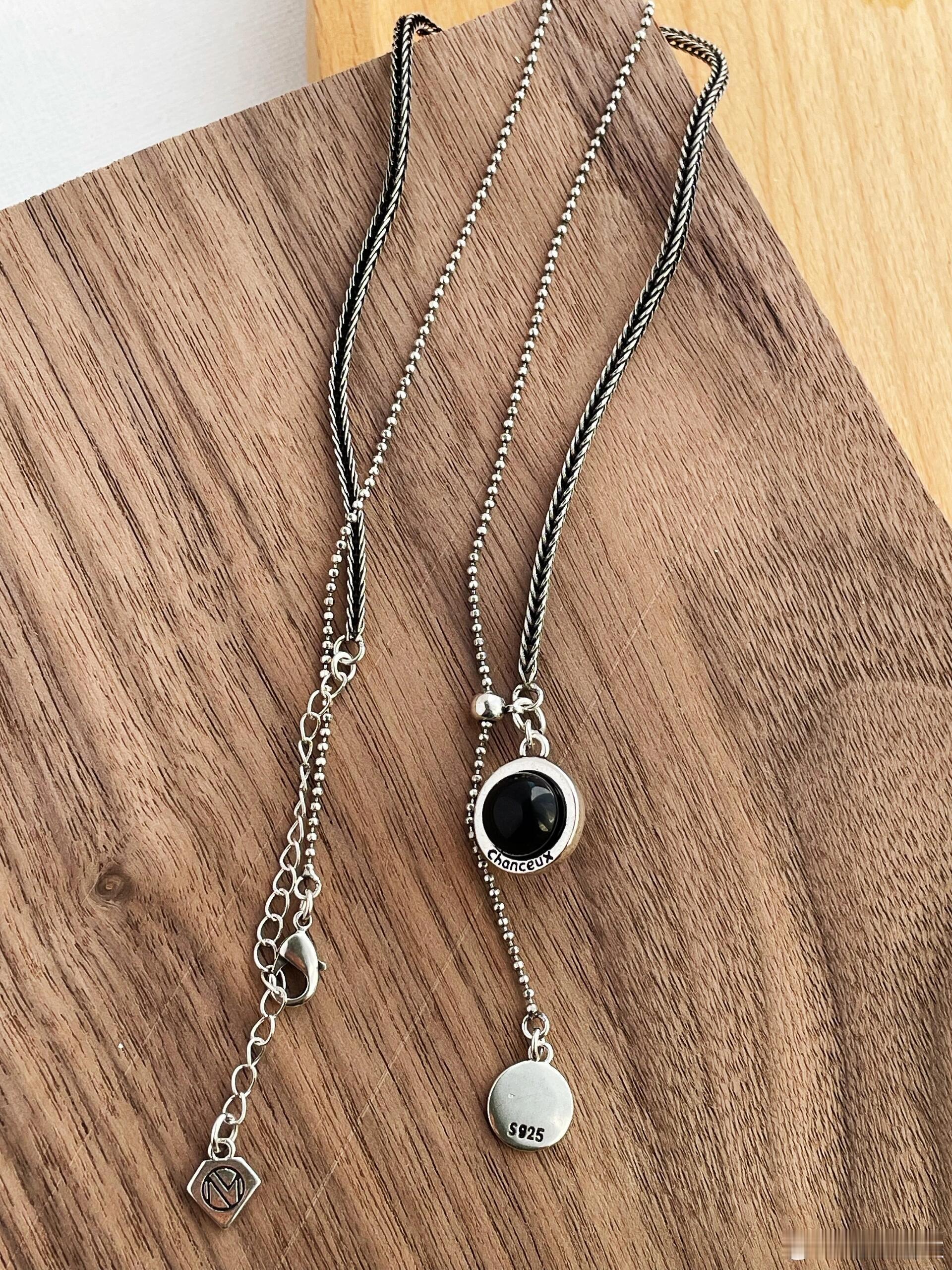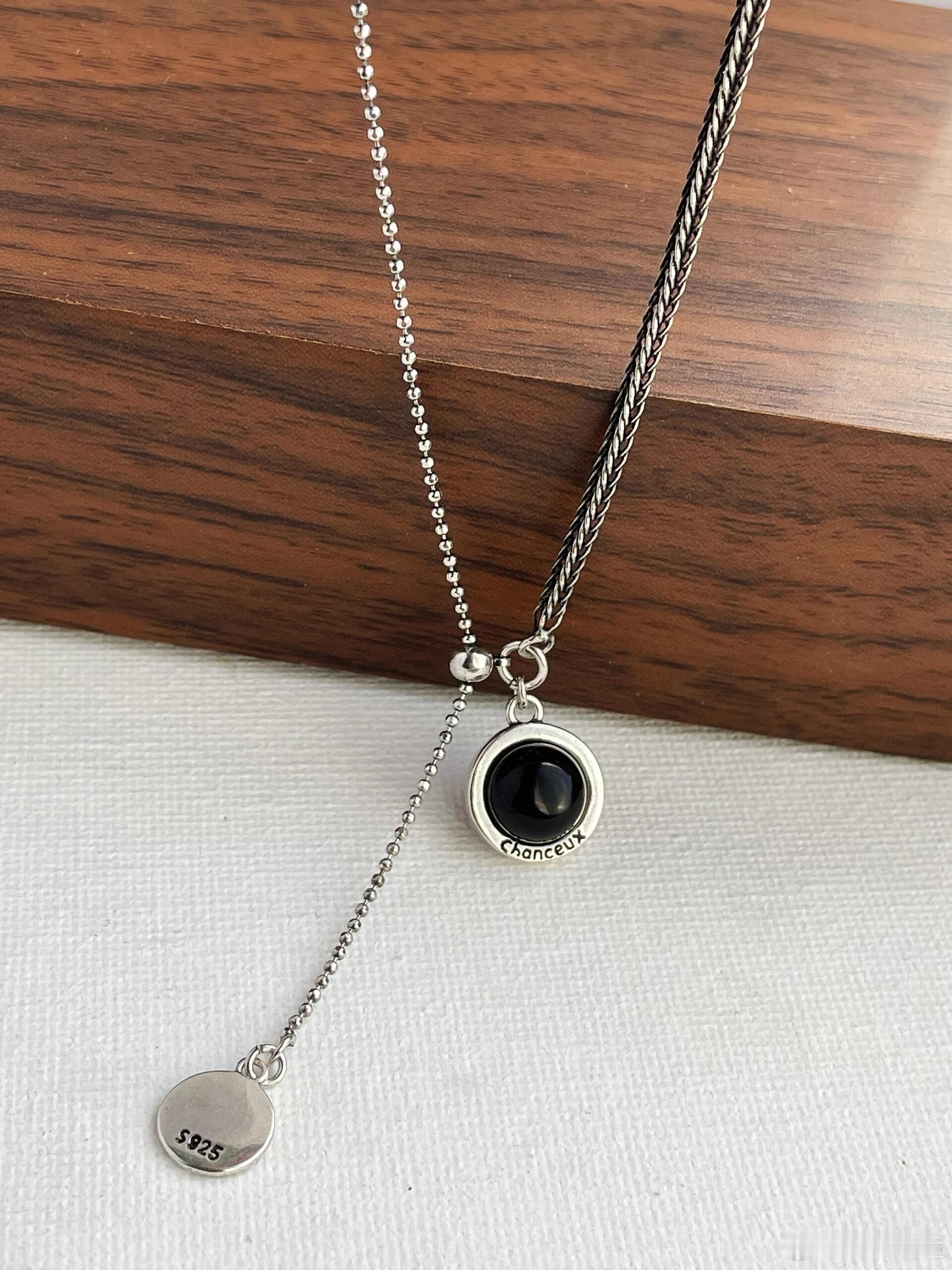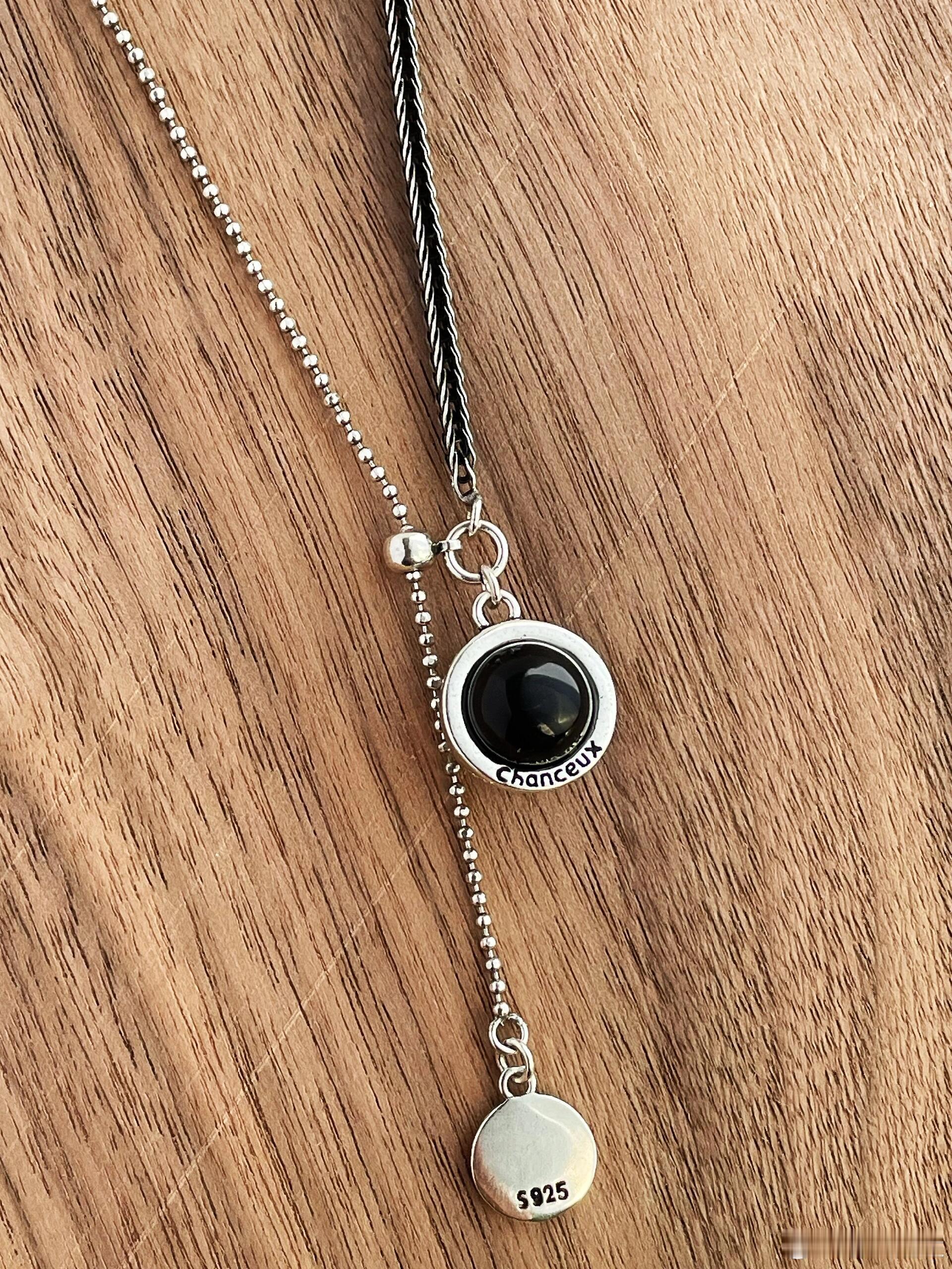 这款名为“Chanceux”(幸运者)的银色项链,是一件设计精巧、寓意美好的个性饰品。其最独特之处在于双吊坠设计:上方主吊坠是一枚镶嵌于银质底座中的深邃黑色玛瑙,底座上清晰刻有法文“Chanceux”,赋予其“幸运常伴”的美好祝愿;下方则垂坠着一枚刻有“S925”纯银标志的小巧圆牌,二者通过短链相连,层次感十足。