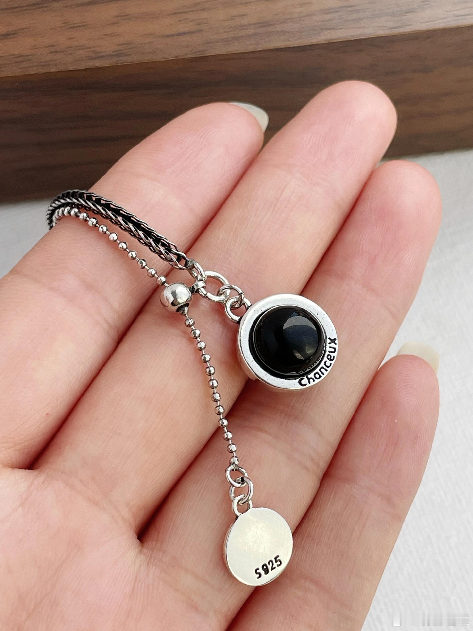 项链链条则由粗犷的麻花链与纤细珠链组合而成,丰富了视觉肌理。它被静置于掌心,在暖调木纹与织物的衬托下,银与黑的冷冽光泽更显精致。整体设计完美融合了复古韵味与现代极简风,既是一件低调的日常配饰,更是一份承载着祝福与品味的幸运信物。时尚配饰