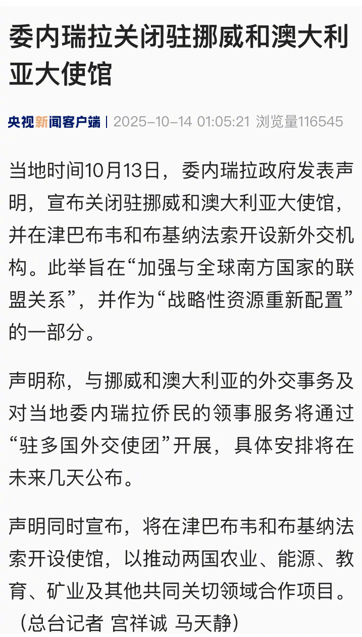 【委内瑞拉关闭驻挪威和澳大利亚大使馆】当地时间10月13日,委内瑞拉政府发表声明,宣布关闭驻挪威和澳大利亚大使馆,并在津巴布韦和布基纳法索开设新外交机构。此举旨在“加强与全球南方国家的联盟关系”,并作为“战略性资源重新配置”的一部分。(央视新闻)#黄金有望突破4100#