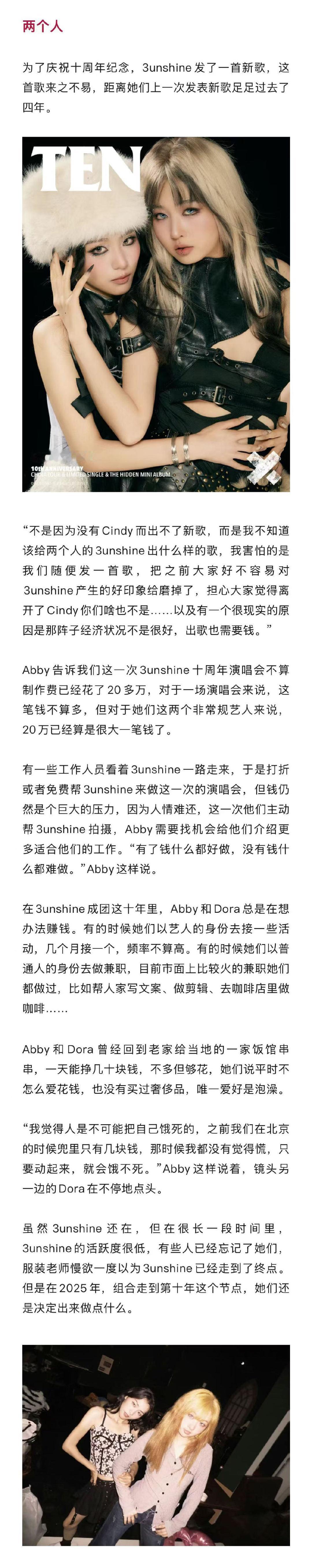 3unshine回应解散危机 3unshine说组合缺一首大爆曲 在新浪娱乐专访中说在Cindy单飞后,组合陷入到停滞期,同时她们迫于经济压力有做过兼职,包括帮人家串串、去咖啡店打工……此次十周年演唱会的开销均由成员自己承担,不算上制作费已经花了20多万。