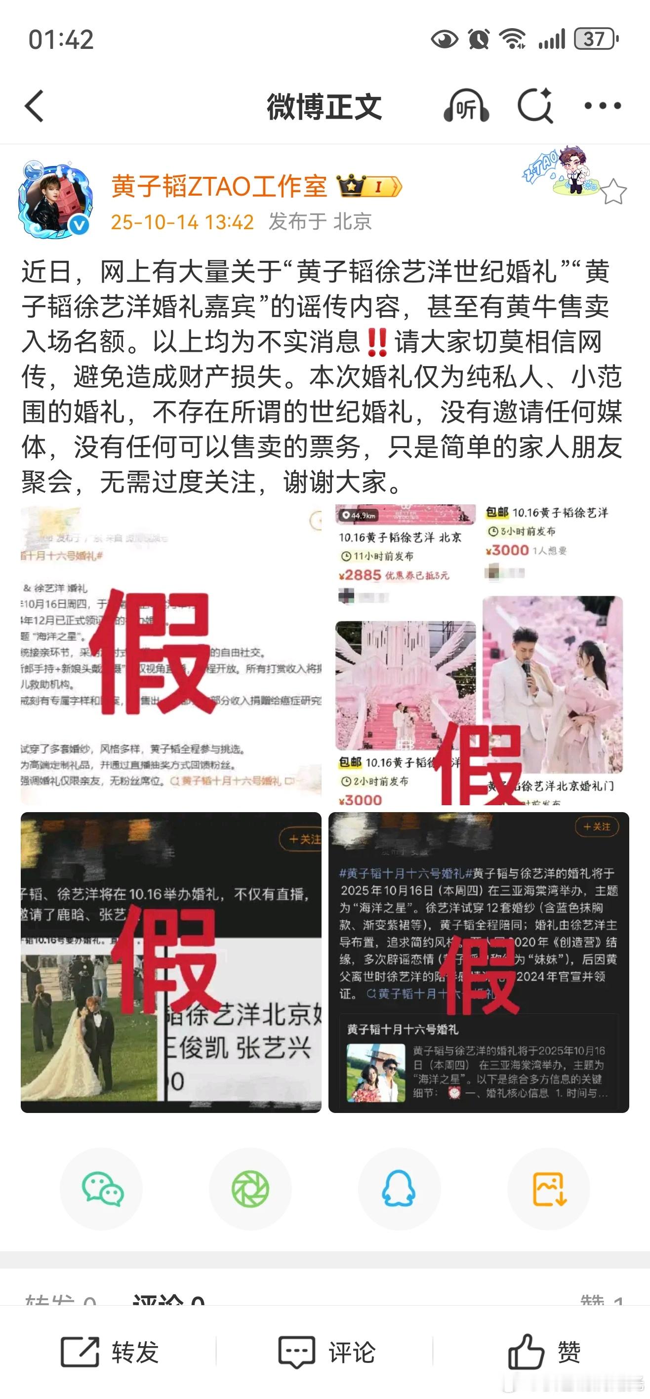 工作室回应黄子韬婚礼黄子韬方回应婚礼回应