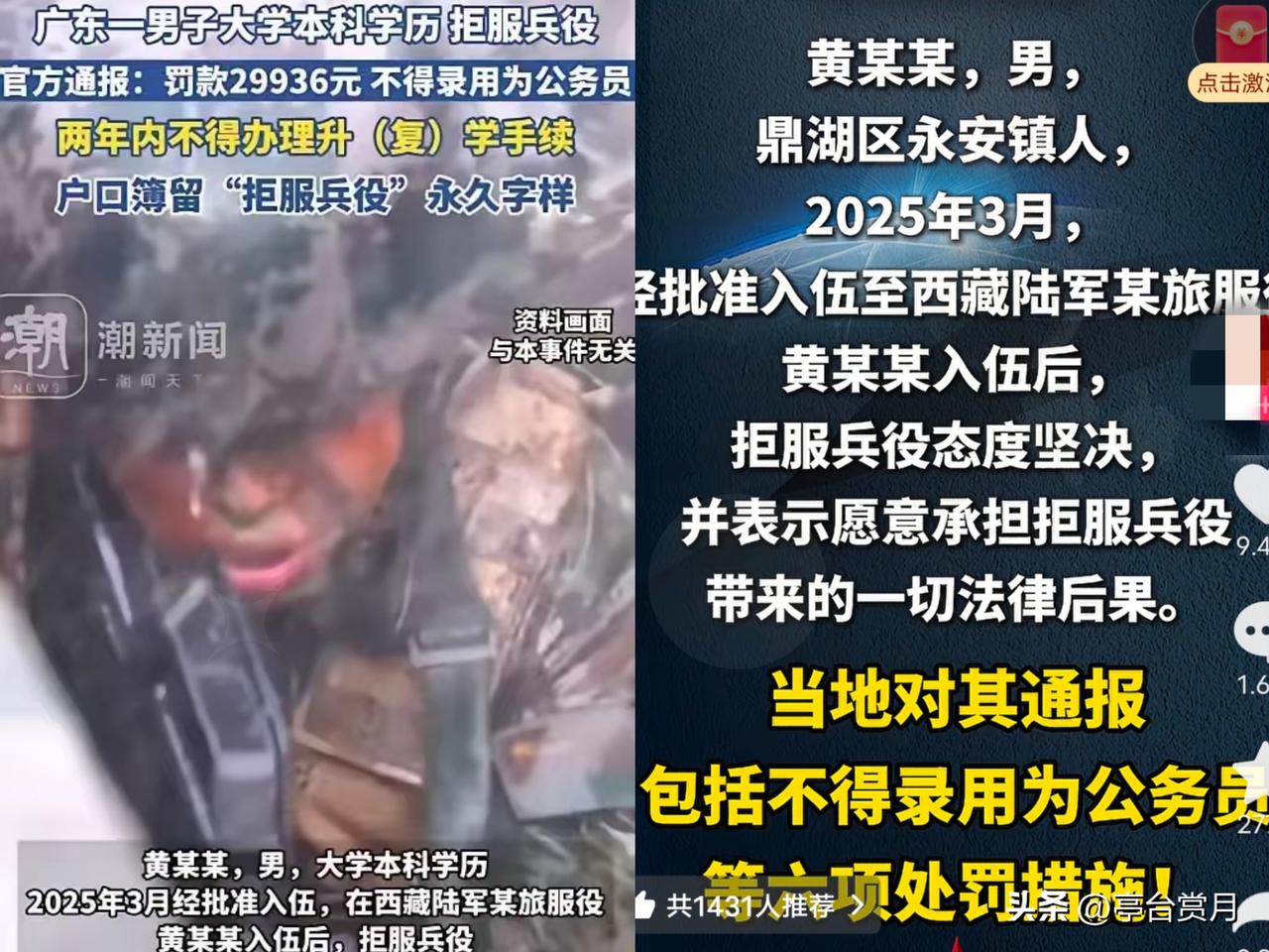 广东肇庆这本科生黄某,真是把 “冲动” 俩字玩明白了!自己主动报名去西藏当兵,检查政审全过了,结果 到了部队嫌训练苦,铁了心要退伍,还说愿担一切后果 —— 现在好了,被除名回家,罚钱近 3 万还背 6 条处罚,这代价够他记一辈子! 说白了,服兵役不是过家家,更不是 “体验卡”。部队苦劝几次,他偏要当 “逃兵”,好好的前途全毁在 “吃不了苦” 上。 网友说得对,入伍前只看到优待政策,没想过里面的艰苦和付出。征兵名额有限,你占了又反悔,这不是坑人吗? 这黄某怕是报名前脑子就没拎清,只盯着当兵后的好处 —— 比如考公加分、学费减免这些优待,压根没琢磨西藏当兵有多苦。高原上训练,光是缺氧就让人喘不上气,每天负重跑、练战术,哪有在学校里轻松?他倒好,政审体检一路顺风顺水,到了部队才喊苦,早干嘛去了? 部队也没少给他机会,领导找他谈了好几次,战友也劝他再坚持坚持,毕竟能去西藏当兵是多光荣的事,多少人想上还没名额。可他倒好,铁了心要走,还拍着胸脯说 “愿担一切后果”,真以为部队是想来就来、想走就走的地方?现在被除名,近 3 万罚款相当于普通本科生大半年工资,6 条处罚里还有 “终身不得录用为公务员”“不能考事业单位”,这以后找正经工作都得受影响,纯属自找的。 更气人的是他占着名额不珍惜。每年征兵名额都紧张,尤其是去边疆的,多少热血青年抢着报名,黄某 倒好,自己主动报了名,把别人的机会挤掉了,结果到了部队就当逃兵,这不是坑人吗?之前河南也有个小伙子,入伍后嫌苦想退伍,最后不光被罚款,连家里的光荣牌都被收回去了,街坊邻居都戳脊梁骨,这脸丢得可不止自己的。 服兵役本来就是义务,更是责任,哪能凭着一时冲动做决定?西藏的兵守护的是边疆,吃的苦是为了国家安稳,这点觉悟都没有,还当什么兵?黄某 这事儿也给所有人提了个醒:不管做什么事,别只看好处不想付出,尤其是当兵这种大事,脑子一热的冲动,最后买单的还是自己。 各位读者你们怎么看?欢迎在评论区讨论。