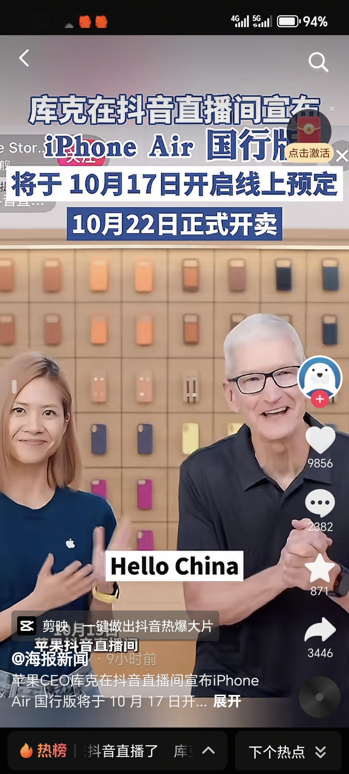 库克来抖音直播了 10月13日晚间,苹果CEO库克现身App Store官方旗舰店直播间并宣布:苹果iPhone Air即将登陆中国市场,近日开启订! 直播里明确iPhone Air 10月17日早9点预售,10月22日开售,256GB版7999元,机身仅5.6毫米厚,是苹果首款仅支持eSIM的机型。直播在线人数超10万,结束后近7万用户锁定购买资格,话题热度破840万。 这款手机搭载A19 Pro芯片,3nm制程工艺,《原神》60帧运行2小时机身仅41.2℃。三大运营商已支持eSIM服务,中国移动获商用试验批复,用户可远程激活,招商银行相关分期申请量24小时激增370%。 库克亲自下场直播,是苹果深耕中国电商生态的信号,打破以往高冷形象。7999元定价精准卡位中端市场,配合抖音等新渠道,意在争夺年轻用户。但eSIM普及度仍是关键,其背后的本土化与技术革新平衡,将影响市场接受度。库克发布会 直播间苹果 美国苹果发布会 苹果直播 直播间抽苹果 库克访京 库克库克