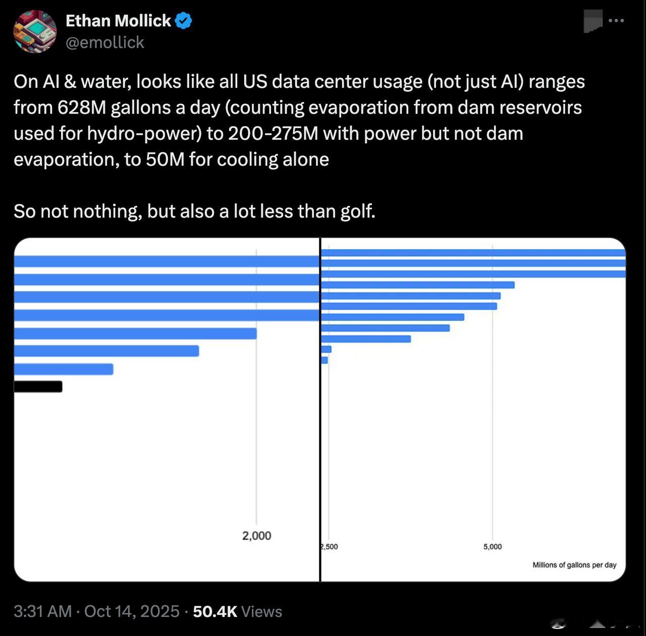 Ethan Mollick总结说:“AI不耗水比起高尔夫球场,真的不算什么。”