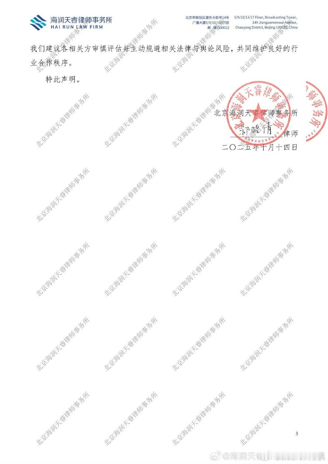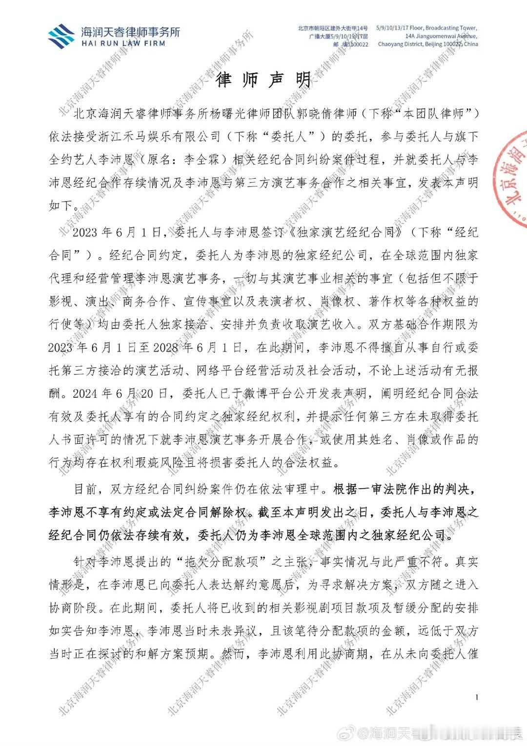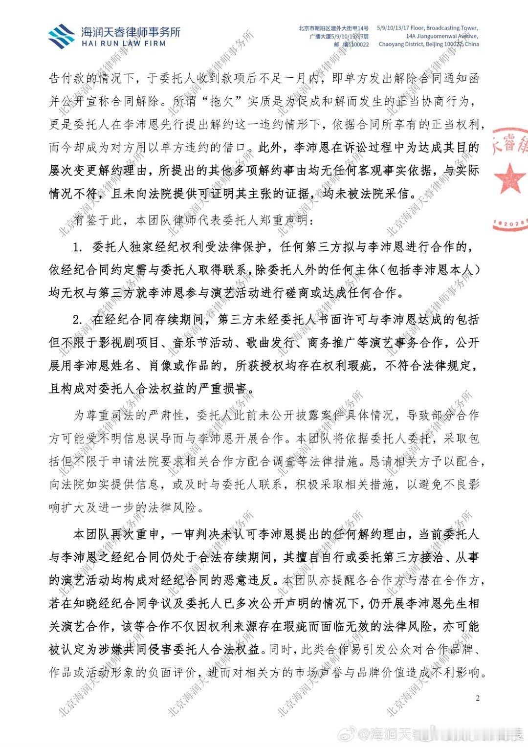 李沛恩经纪公司律师声明 李沛恩经纪公司就经纪合约纠纷委托发布律师声明,强调是其全球范围内独家经纪公司,而且不存在拖欠分配款项等问题。⬇️