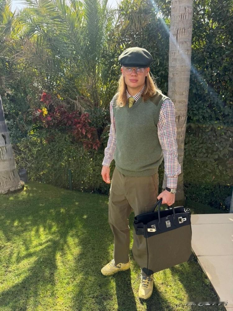 哈兰德强是真的强,丑也是真的丑[我想静静] 近日,哈兰德在社媒晒出自己穿搭的照片,头戴绿色帽子(外国人一点不避讳),穿着绿色马甲和格子衬衫以及橄榄绿裤子,手里还提着黑绿色帆布包包,这个形象很像恐怖电影里面的反派。 哈兰德在气质和穿搭方面真的得好好和C罗学习学习了,没有一点巨星的风采,气质上就输了,男人最重要的就是气质。