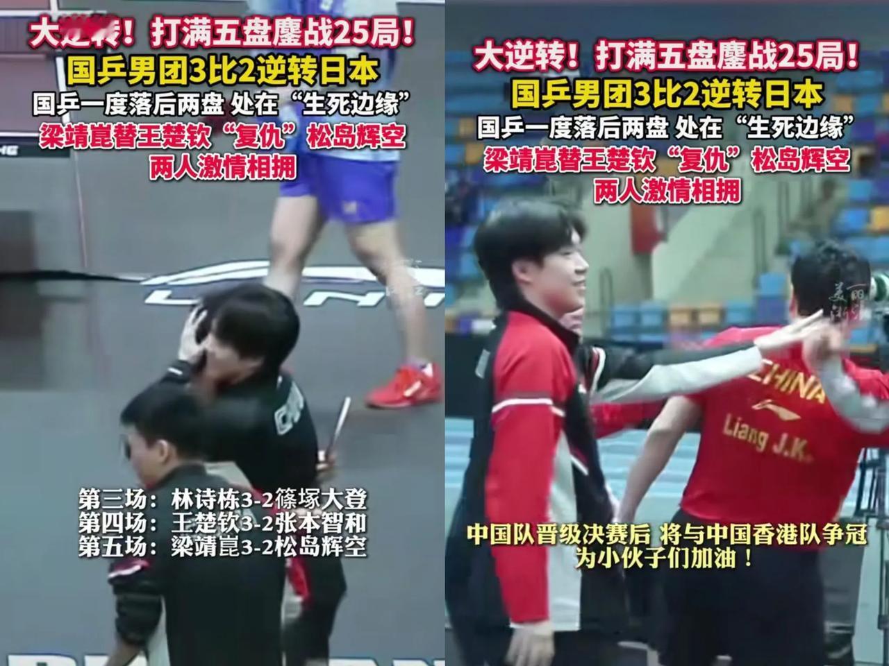 一觉醒来,国乒男团火火火火火, 全国人民都知道了!0 - 2落后日本队,看得人心里那叫一个着急,难道咱的国球要走下坡路了? 但咱中国队是谁啊,输给谁也不能输给日本队!只要比赛没结束,就绝不放弃!梁靖崑、王楚钦、林诗栋三位小伙儿,一球一分地拼,打满25局,历经4个小时的艰难追赶,每人扛下一分,实现3 - 2的惊天逆转,太牛了! 成功晋级决赛,真为他们骄傲!他们不仅守住了祖国荣誉,还让世界看到中国精神! 希望健儿们能好好休息,教练也能更多关心运动员,全力以赴拿下冠军!🏆 话说,友友们知道张本智和为啥比赛时多次换球衣不?快来唠唠。