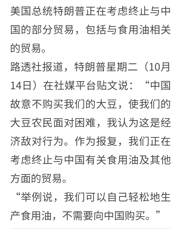 中美经贸博弈路透社报道,特朗普星期二(14日)在社媒平台贴文说:“中国故意不购买我们的大豆,使我们的大豆农民面对困难,我认为这是经济敌对行为。作为报复,我们正在考虑终止与中国有关食用油及其他方面的贸易。