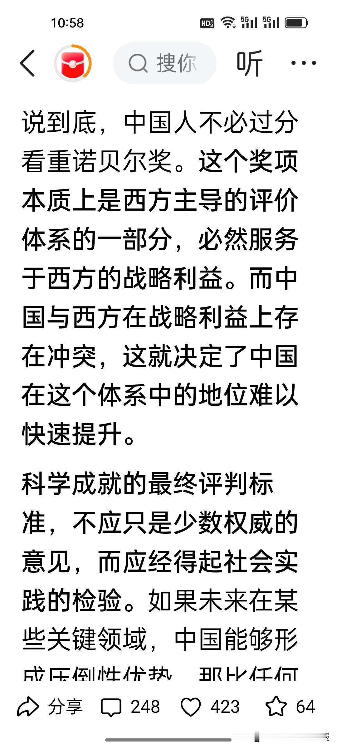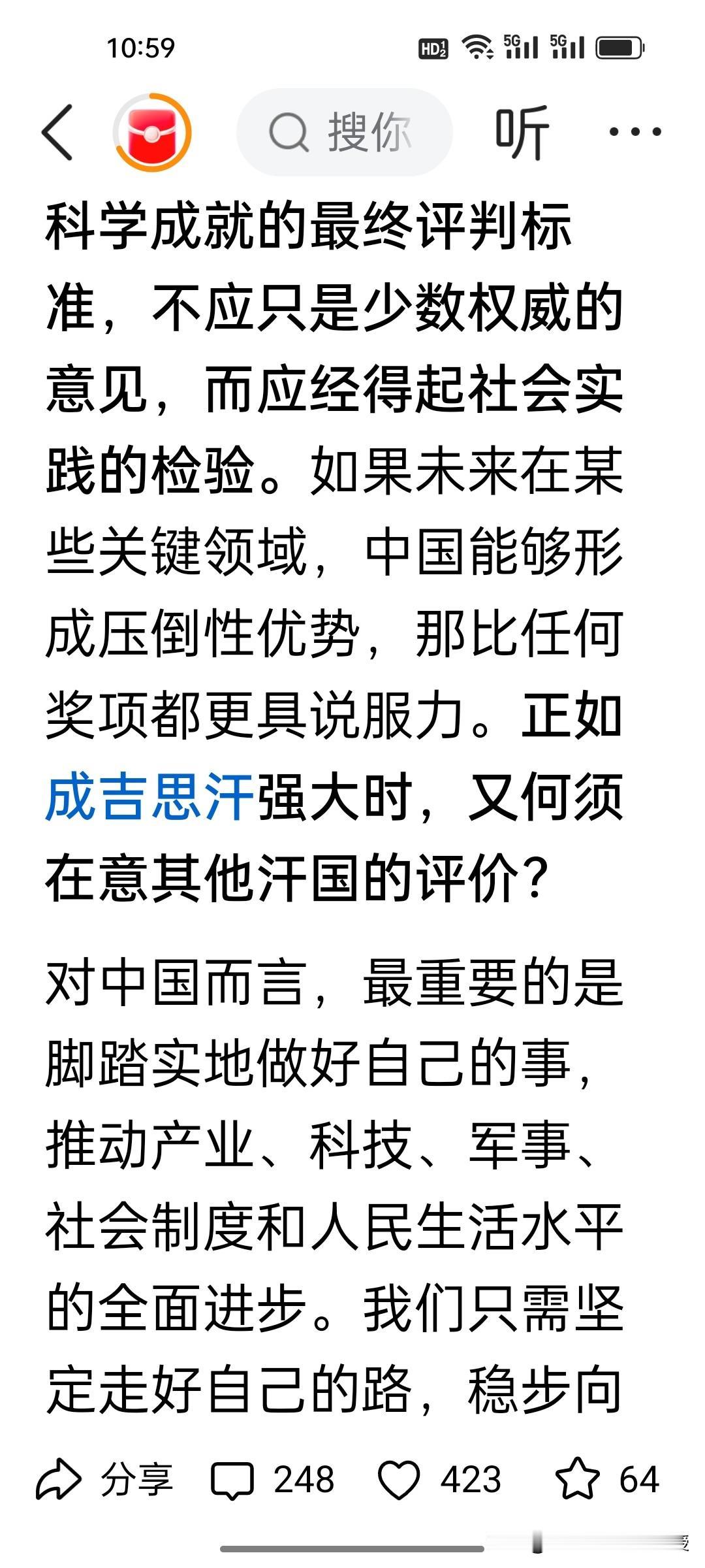 金灿荣认为,西方基础科学研究方面依然实力雄厚,中国在这方面确实存在差距,这导致中国也许永远不会出现日本式诺贝尔奖井喷。 但是,金灿荣认为基础理论研究的目的是要推动生产力的发展,也就是说,理论要创造价值,科学成就的评价标准要经得起社会检验,光纸上谈兵没有任何应用价值。 我认为金灿荣教授说的对。西方的评价标准归根到底还是为了维护西方国家的权威和利益。因为我们中国取得的成就是一百个诺贝尔奖都换不来的,我们没必要因为基础科学大差距而妄自菲薄,像邓稼先,钱学森,袁隆平等这些切实推动国家发展、改善民生的成就,其重量远超任何奖项的光环。这种以实际价值为导向的科研路径,让我们国家在发展中走得扎实且坚定。
