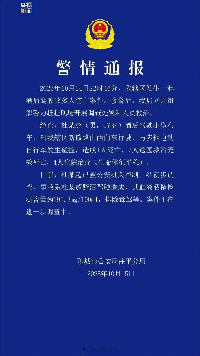 【山东聊城一起酒驾致8人死亡 案件正在进一步调查中】经查,杜某超(男,37岁)酒后驾驶小型汽车,沿辖区新政路由西向东行驶,与多辆电动自行车发生碰撞,造成1人死亡,7人送医救治无效死亡,4人住院治疗(生命体征平稳)。目前,杜某超已被公安机关控制。经初步调查,事故系杜某超醉酒驾驶造成。案件正在进一步调查中。