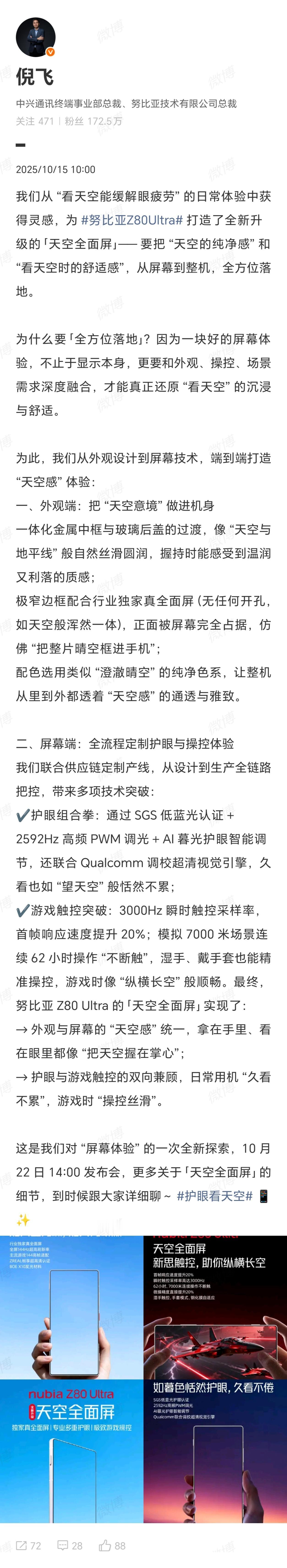 努比亚Z80 Ultra这一次的屏幕,升级成为了「天空全面屏」,也是花了很多心思。 倪总说了灵感来自天空的纯净和舒适,这个在屏幕上面确实也很有必要。极致的全面屏努比亚一直在探索,以前需要有妥协一点显示效果之类的,但这些年的摸索总结和进化下来,现在可以不留遗憾了。 这一次依旧不用开孔,边框更窄,让整块的屏幕更加的纯粹极致,是天空的宽广无界。而天空的纯净和舒适,对应的就是显示效果和护眼,色彩、分辨率、刷新率、护眼,也全都有了。触控上面也有3000Hz的瞬时触控采样率,能够保障更加的跟手。所以这次,Z80U是好看耐看能拍能打,妥! 这样的屏幕形态,应该也会是未来的最终归宿吧?