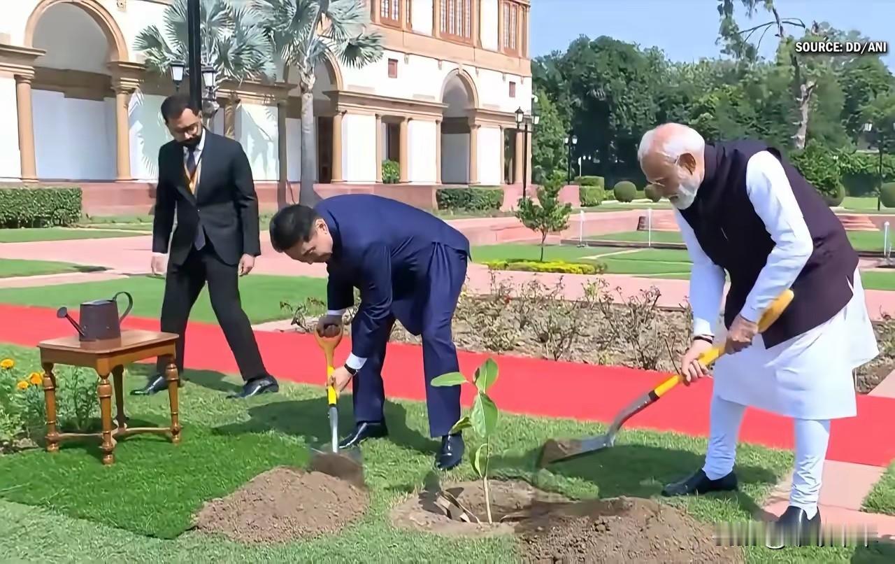 印度总理莫迪以东道主身份陪同到访的蒙古国总统种下了象征印蒙两国友谊的小树苗,期望两国关系如同小树苗拙壮成长,有待一日成为参天大树。这种外交礼节在国际上相当普遍。
