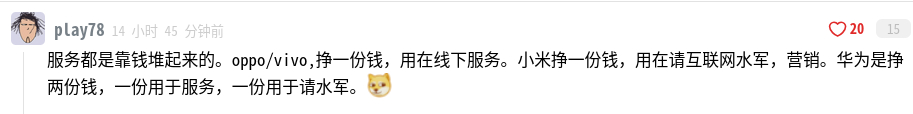 网友这种言论就是典型的性价比论。一个品牌产品,无论华为小米还是oppo VIVO,都是市场定价出来的产品,如果他们脱离市场定价也没人会买单啊,所以不要说赚几份钱,按你们这样讲,苹果赚几份钱?给你提供了什么服务?手机摔坏了免费给你换个iPhone17Pro?宝马奔驰奥迪给你提供了什么服务?难道不是售后割你么?