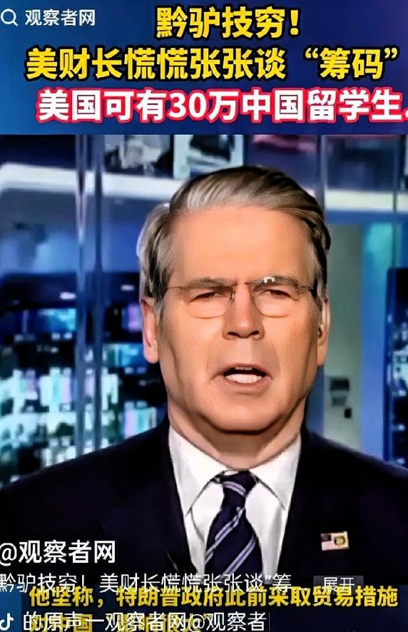 美国急了, 美财政部长:“我们的制裁对中国影响很大,我们还有筹码,那就是在美的 30-40 万留学生!” 美国这回是真急了,美财政部长说的话也太不客气了 —— 居然把在美的 30 到 40 万中国留学生当成了筹码,这跟拿人质要挟有啥区别? 要知道,美国一直自称是全球最讲人权的国家,结果现在说出拿学生当筹码的话,这反差也太大了,听着就让人不舒服。 网友都看不下去了,说上一次美国就拿学生说事,还从中捞到了些好处,现在居然想再用一次!这也说明美国能耍的手段其实没多少了,已经开始用这种不光彩的招。 还有网友说,咱们的留学生要是没从上一次的事里吸取教训,还往美国跑,那就是自己往坑里跳,其实也不值得太同情。国家尽到该尽的本分就行,个人也得为自己的选择承担责任。 说实话,美国拿留学生当筹码,嘴上喊着人权,实际心里只想着自己的利益。要知道这些留学生每年给美国贡献 140 亿美元,可换来的不是尊重,而是被当成要挟的工具。 不过这事也不是全坏,它能让更多人看清美国的真面目,反而会让更多人才愿意留在国内发展,从长远看,这未尝不是件好事。 对此你怎么看?