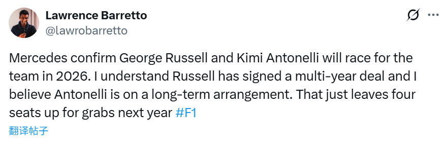 F1官网记者Lawrence Barretto谈到两位梅赛德斯车手合同年限时说道:“我了解到拉塞尔已经签下了一份多年合同,我相信安东内利是一份长期协议。”