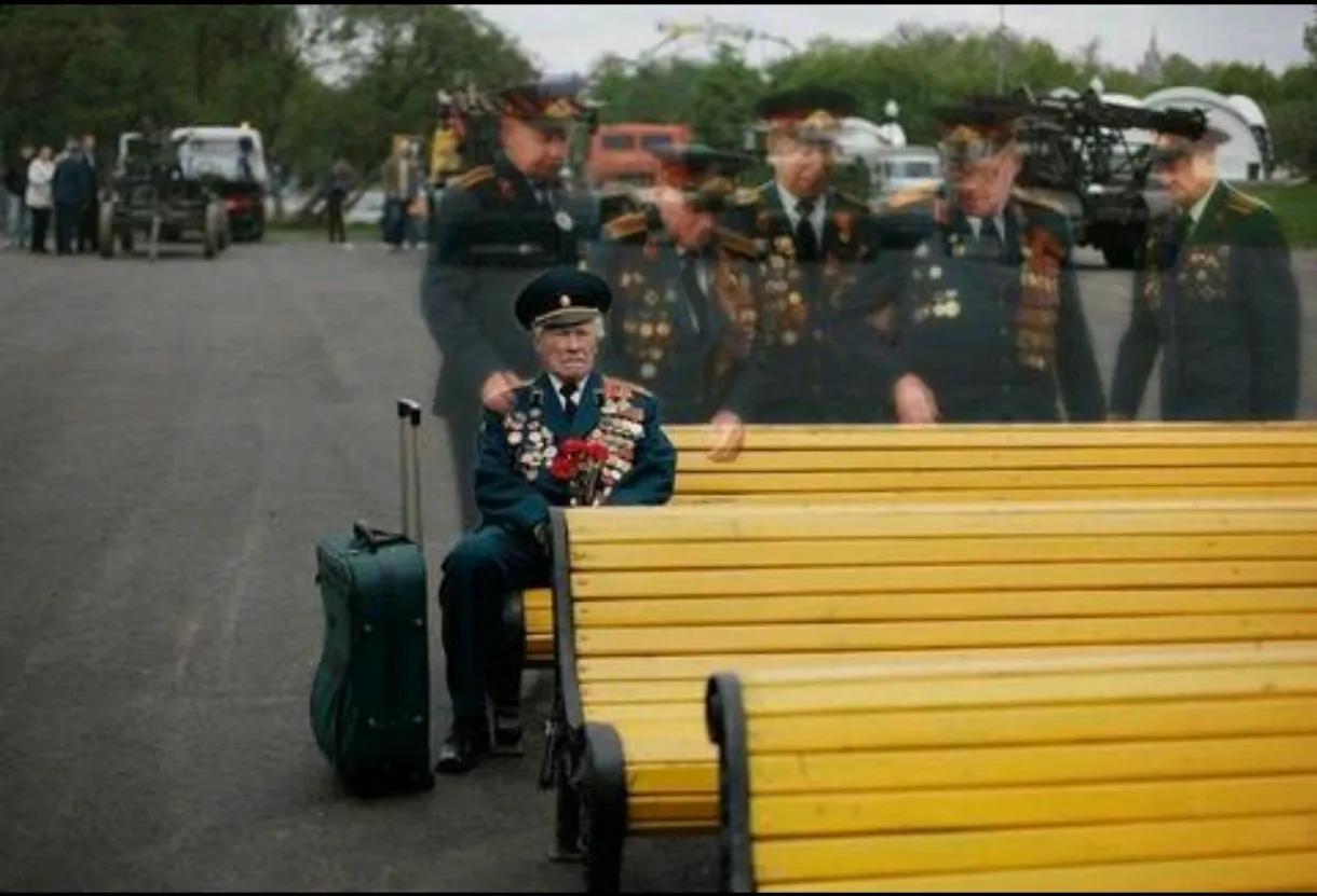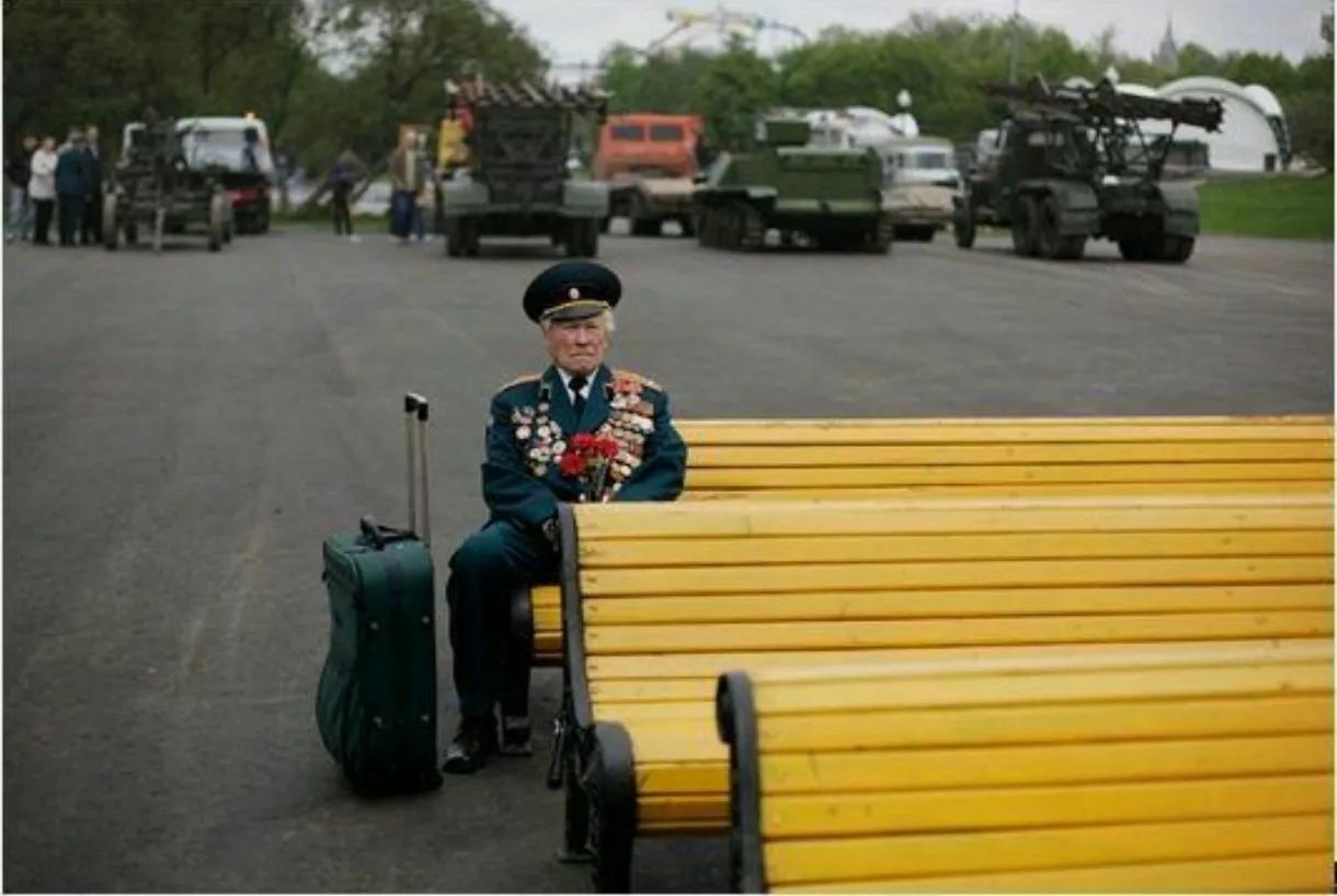 2011年5月9日,莫斯科红场的长椅上,92岁的彼得洛维奇.热列佐夫孤独坐着,这