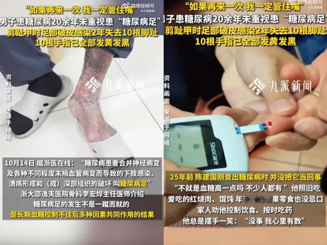 “可惜没有后悔药!”浙江一男子剪脚指甲,不慎剪破拇趾边缘,出血并不多,他贴了一张创可贴就没再管了 可过了几天,伤口不仅没愈合 ,开始红肿、发痛走路也磨得难受。 后来竟磨出一个水疱,破了之后一直流脓液,一个月了也不见好,最后导致10根脚趾被全部切除! 谁能想到,去年春天那次剪指甲,剪破的一点点皮,会酿成这样的悲剧。当时出血就那么几滴,他随手贴了创可贴,转头就忘了。 晚上照样吃大半盘红烧肉,灌一瓶甜饮料,家人劝他“你有糖尿病,伤口得注意,少吃点甜的”,他满不在乎:“小口子算啥,血糖高点没事,我身体硬朗着呢。” 三天后,创可贴下面又痒又疼,拆开来一看,伤口周围红了一圈,走路磨得钻心。可他还是没当回事,擦了点碘伏,换张新创可贴继续扛。 那时候脚已经有点麻了,前阵子踩了钉子都没感觉,他也只当是“走路多了累的”,压根没往糖尿病上想。 又拖了一周,拇趾肿起来,还起了水疱,破了之后流黄脓,闻着都发臭。他总算有点慌了,可赶上公司加班,又把去医院的事往后推。 等真到医院时,右脚肿得像个馒头,大拇趾紫黑一片,医生皱着眉说:“糖尿病足感染,必须截肢!” 第一次手术截了右脚大拇趾,医生反复叮嘱要控糖、按时吃药、护好脚,他嘴上应着,回家该吃甜的还偷吃,药也三天打鱼两天晒网。 “少一次药、少测次血糖,能咋地?”就这想法,让两个月后相邻的脚趾也黑了、烂了。 再去医院,医生只能无奈再截。接下来两年,五次手术,一次截一点,直到十根脚趾全没了。现在他连楼梯都爬不了,只能坐轮椅,翻出以前穿皮鞋的照片,眼眶就发红。 直到这时他才真的悔了,每天按时吃药,严格控糖,用37度以下的温水洗脚,擦干脚趾缝,穿宽松袜子前都要检查鞋里有没有异物。 家人也天天盯着他吃药、测血糖,他见了糖友就劝:“千万别学我,小伤口也得重视,血糖一定要管住!” 可再怎么补救,脚趾也回不来了。他现在最大的愿望,就是能通过康复训练,丢下轮椅拄拐走。 这事儿哪是“小伤口没注意”?是他一次次对糖尿病的轻视,把小隐患拖成了毁终身的大灾难。 其实很多糖友都像以前的他,觉得“血糖高点没事”“小伤口不用管”,可糖尿病最坑人的地方,就是让你对伤口不敏感,等察觉不对劲时,感染早就扎了根。 你身边有没有这样不把糖尿病当回事的人?要是你家里有糖友,会怎么帮他重视足部护理和控糖?