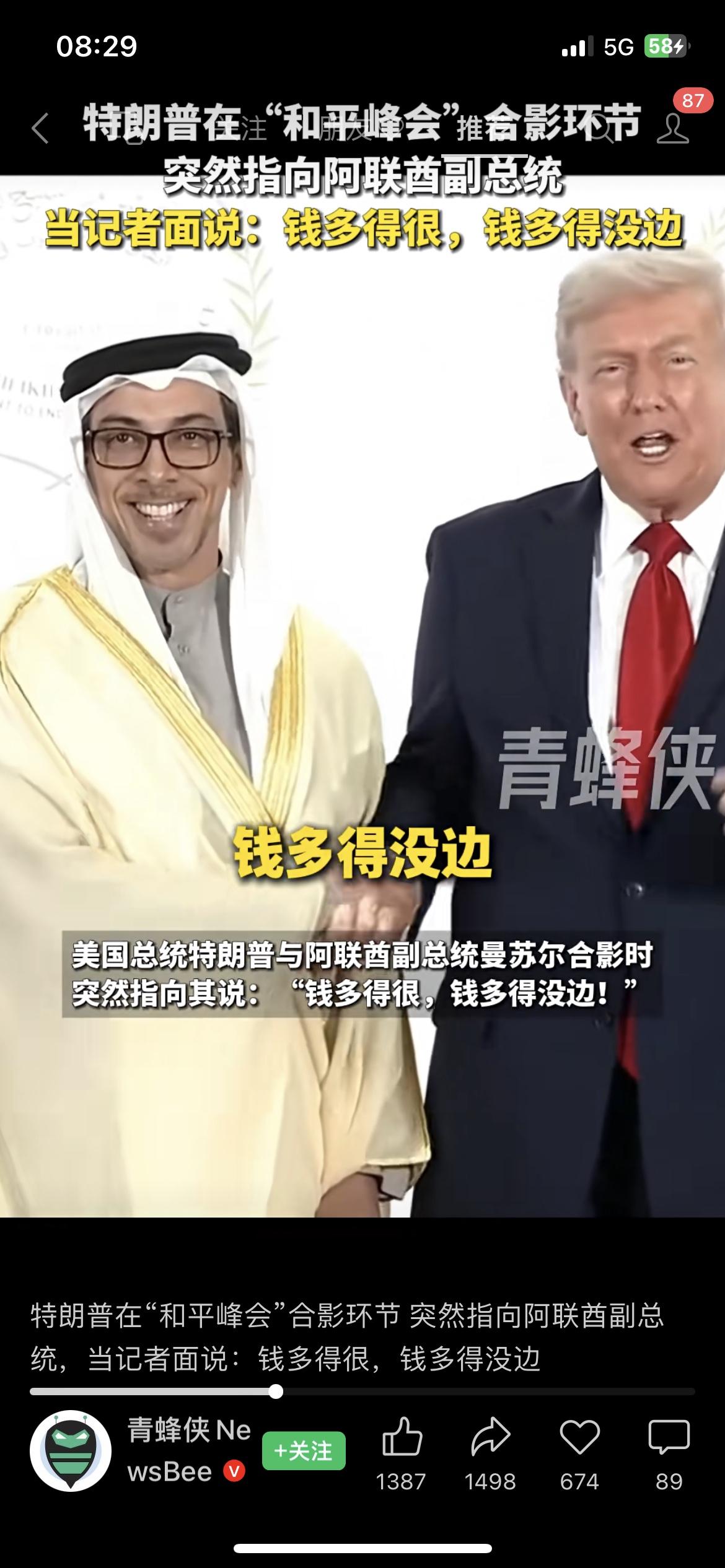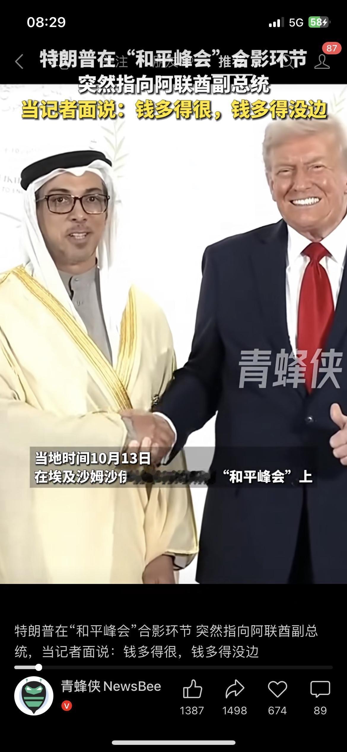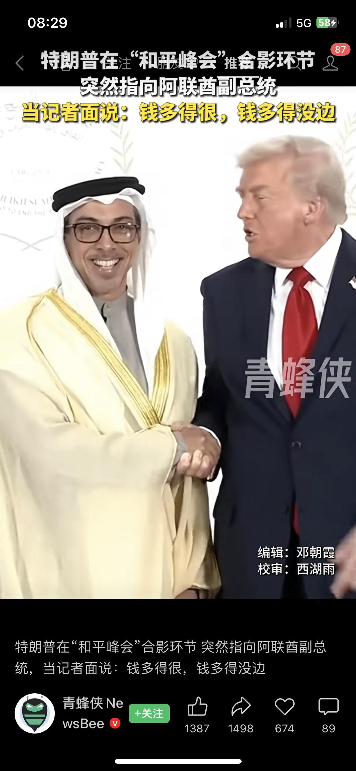 特朗普在“和平峰会”合影环节对阿联酋副总统发表言论 当地时间10月13日,在埃及沙姆沙伊赫举行的“和平峰会”合影环节,美国前总统特朗普指向阿联酋副总统称:“钱多得很,钱多得没边。” 这一言论引发关注,具体背景和影响仍在观察中。国际新闻 特朗普 外交