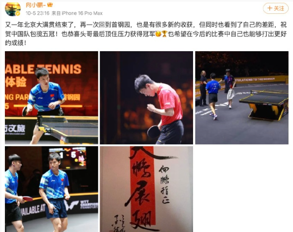 10月16日,向鹏发文总结北京大满贯,“又一年北京大满贯结束了,再一次回到首钢园,也是有很多新的收获,但同时也看到了自己的差距,祝贺中国队包揽五冠!也恭喜头哥最后顶住压力获得冠军,也希望在今后的比赛中自己也能够打出更好的成绩!”