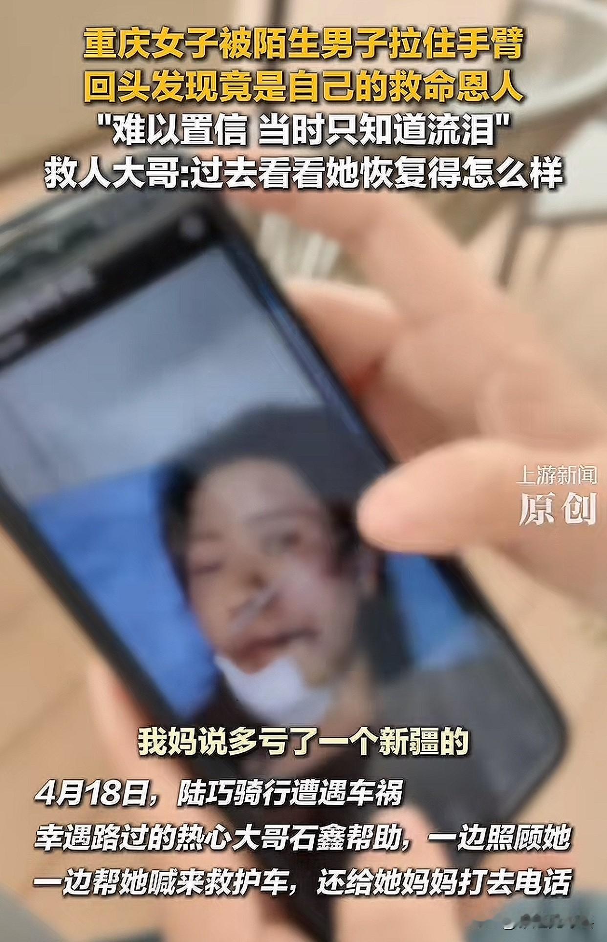 “被陌生人惦记的温暖!”重庆,半年前车祸里帮忙的水电工,居然凭着一段模糊视频,硬是找到了那家炒鸡店去看望受伤的老板娘。说真的,这种过了大半年还放在心上的惦记,比当时他出手相助更让我感动。 今年四月,女子骑电动车去买菜时被车撞了。那位水电工师傅本来完全不认识她,却主动挤进人群,帮忙叫救护车、联系家人,还脱下自己的外套给她披上。他一直陪着她等到救护车来,然后悄悄离开。可最难得的是,这事过去半年了,他心里还一直记挂着她的伤势,最近特意找上门,就想亲眼看看她好了没有。 说实话,我觉得救人的那一刻是本能,但能把这份关心持续这么久,真的特别珍贵。老板娘也很暖心,留他吃了顿自己做的炒鸡,两人还互相留了联系方式。你看,这样的善意就有了回应,形成了温暖的循环。 在我看来,最打动人心的善良,往往不是一时冲动,而是藏在平凡日子里的那份长久惦记。这种你对我好、我也对你好的真情实意,才是咱们生活中最该珍惜的温暖。