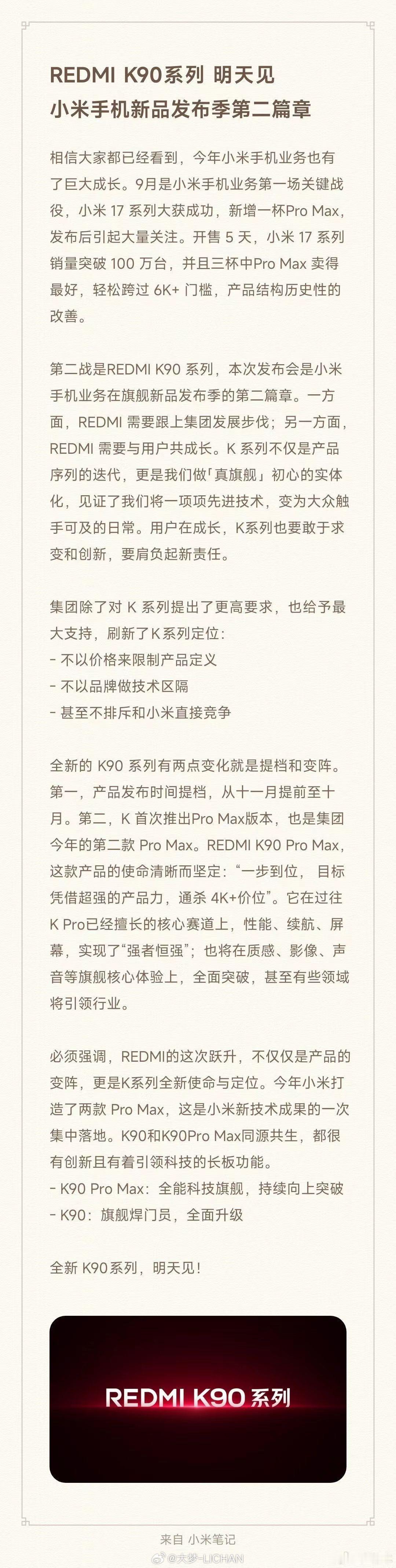 这次的K90也是如此,大家会看到一个全新的红米,相比较以往来说,配置升级已经是完全不值得说的是,而是在产品定义上、创新上、用户需求的挖掘上,小米已经走到了另一个阶段