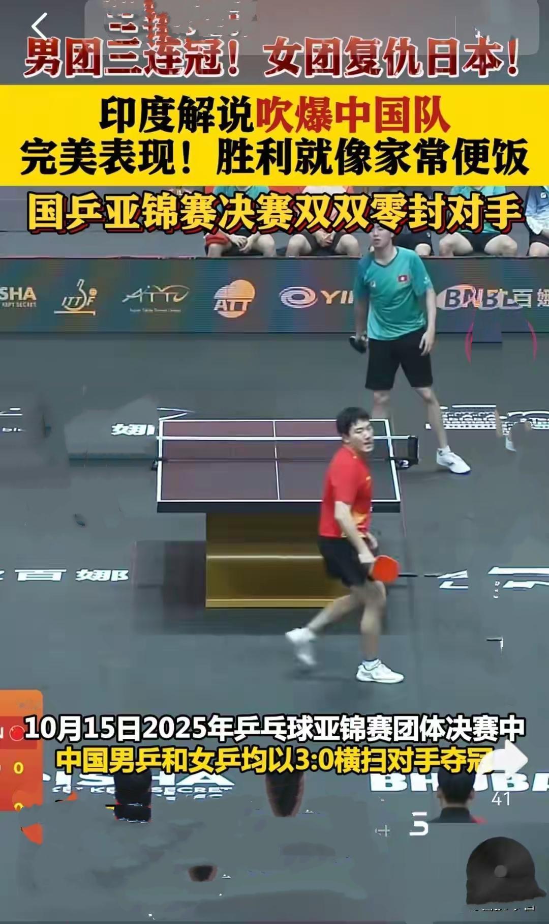 亚锦赛国乒横扫夺冠,印度解说全程惊呼:赢球如吃咖喱饭般简单 亚锦赛赛场,国乒的强势表现让担任解说的印度主播全程处于兴奋状态,高频次的赞叹成了直播标配,直言中国队赢球“像日常吃饭一样轻松”。 在男团1/4决赛关键战中,当中国队与伊朗队战至1-1平时,王楚钦登场扛起胜负重任。面对世界排名224位的霍戴伊,他虽一度被对手追平甚至反超,但凭借精准战术调整掌控局面。反手“霸王拧”技术多次化解危机,正手暴冲与大角度斜线球交替发力,最终以11-8、11-8、11-4的比分横扫对手。见此场景,印度解说嘶吼着赞叹:“Beautiful!这是大师级操作,简直像在跳舞!” 后续赛事中,国乒的统治力持续释放。男团决赛以3-0完胜对手,将三连冠收入囊中;女团则同样以3-0的比分干净利落击败日本队,成功报了过往赛事的一箭之仇。从关键战到决赛,国乒全程未给对手太多机会,每一次得分都展现出碾压级的实力。 看着国乒一路过关斩将,印度解说忍不住感慨:“他们赢球就像我们吃咖喱饭一样简单,这实力差距也太大了!” 而这场被解说视作“轻松取胜”的征程,背后是王楚钦在落后时连得6分的抗压能力,是团队战术的精准执行,更是国乒积淀已久的硬实力体现。乒乓亚锦赛 亚洲乒乓亚锦赛