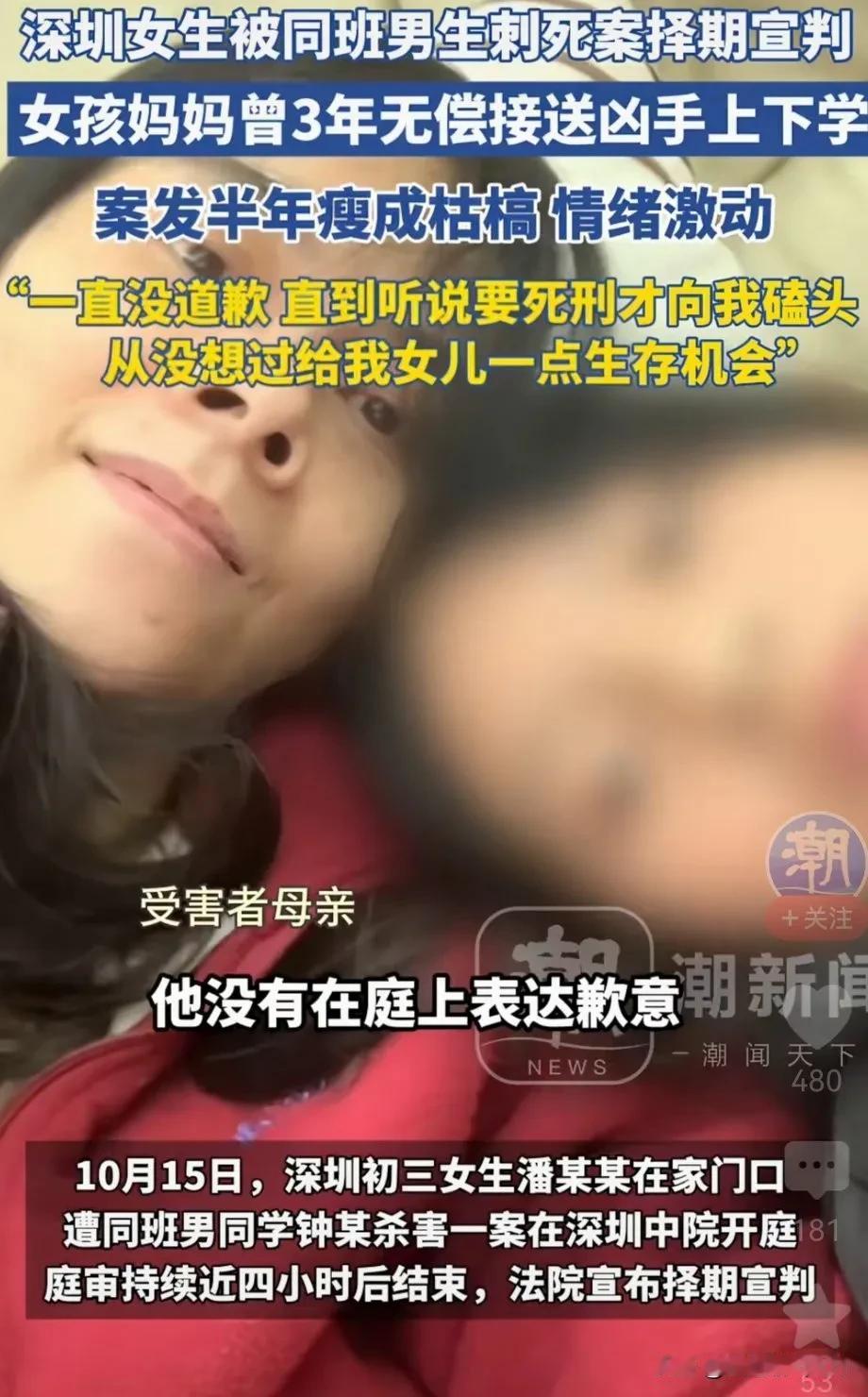深圳14岁的钟某真的就是个恶魔,他把和他住同一楼区楼区的潘某某杀害后。谎称他见义勇,话说事发当天,钟某某对潘某某产生不满,放学后钟某某尾随潘某某至其楼下,他追到潘某某单元门洞。他把在网上买的折叠刀掏出来,绕到潘某某的面前用折叠刀刺向潘,某。 手段残忍令人发指,第一次他看没有把潘某某杀死,反过身又接着捅潘某某数刀,致潘某某死亡。