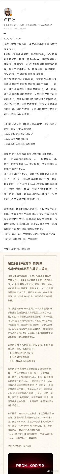 卢伟冰称K90不排斥和小米直接竞争Redmi K90系列明日登场,自带品牌战略升级的重磅信号!小米不仅对其提出更高要求,更赋予“三不”新定位:不以价格限定义、不以品牌划技术、不惧与小米竞。瞄准4K+价位的全能旗舰,正以打破边界的魄力,誓要重塑旗舰市场的竞争格局!