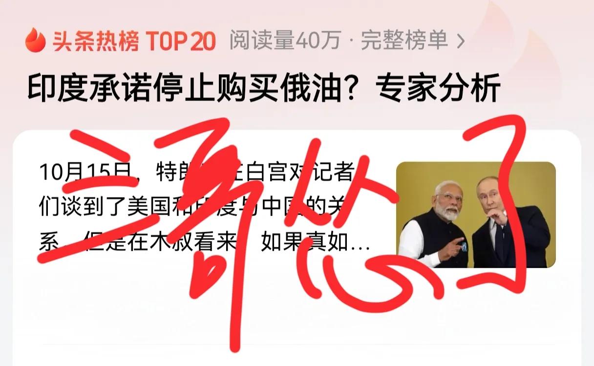 三哥可能要怂呀!不靠谱说莫大仙承诺停止购买俄油,如果是真的,那咱们哥就是独家买俄油了,可以当经销商了,进口转外销,赚点差价,岂不美哉! 咱们可是一点都不给不靠谱面子呀!实力完全不允许! 继续买俄油,接着奏乐接着舞!