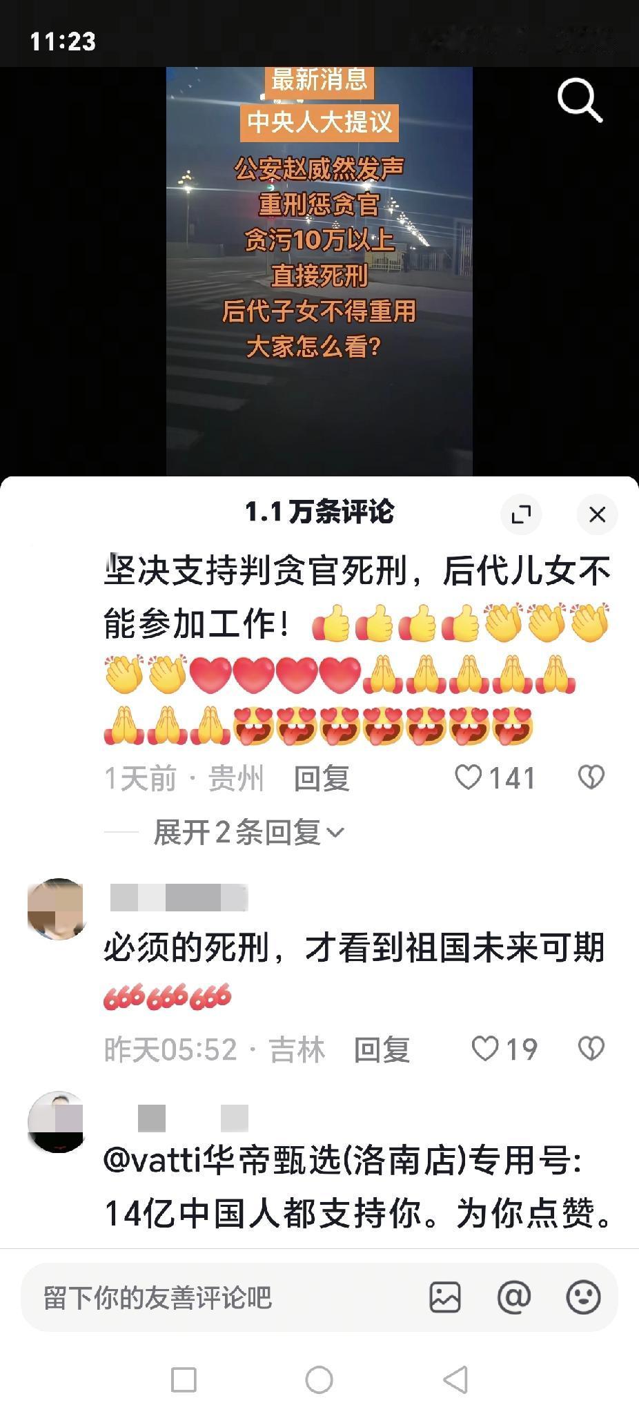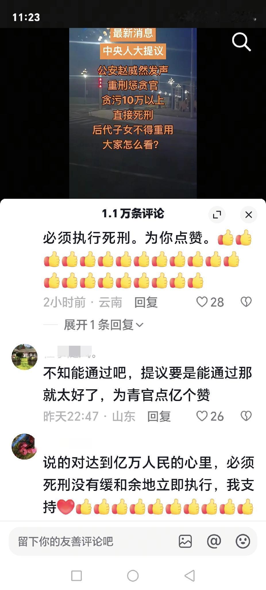 看到一则消息:公安赵威然发声提议,重刑惩贪官,贪污10万以上直接死刑,后代子女不得重用。 先不说这个消息是真假,单看评论区网友留言,可见这个提议有多得民心了。大家都说这个提议非常好,大力支持,希望在法律上能实现。 现在国家大力查处贪腐,可查实之后重刑的很少,有的贪官进去几年后出来仍然宽松度日,可见早就备好了养老余钱。 就像老百姓猜测的那样,贪腐的钱很少有被全部缴回的,贪官是在用几年的牢狱换子女和自己余生宽松的生活。 如果达到一定数额重判死刑的话,便会震慑那些想要贪腐的人,毕竟生命的代价和牢狱的代价不是一样的。官员贪污 腐败分子 杀腐败 国家反贪腐