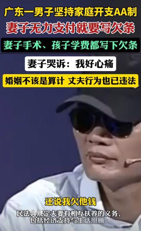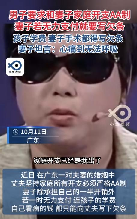 10月12日报道,婚后男子严格要求AA制,妻子没钱看病都要打欠条!面对如此冰冷的账本婚姻,妻子坦言心痛到无法呼吸!而网友炸锅了! 王女士(化名)和老陈(化名)是通过相亲认识的。 谈恋爱的时候,老陈就说自己花钱很仔细,王女士想着精打细算过日子也正常,也没太在意。 可等两人领了结婚证,准备搬到一起住,老陈突然拿出一个笔记本,板着脸对她说:“咱们结婚后得实行AA制,家里所有开销都要对半分,我都记下来,月底咱们对账。” 王女士当时愣住了,她心想,夫妻之间用得着算得这么清楚吗? 老陈却一本正经地说:“亲兄弟还要明算账呢,夫妻把钱算清楚,才能避免矛盾。” 王女士当时也不好顶嘴,想着刚结婚,别因为钱闹得不愉快,就勉强答应了。 可接下来,她才慢慢发现,日子一点也不轻松。 买菜、交水电、孩子用的东西,老陈都要算得清清楚楚,零头多几块都要补上。 连一起出去吃个饭,他都要把自己的那半份转给她。 慢慢地,王女士感觉家里就像开账房一样,没一点温度,每天都活在算计和压力里。 之前,王女士生病需要做手术,手术费加上麻药和住院费,她手头的钱不够,就红着眼眶跟老陈说想先借点钱。 没想到老陈递过一张纸:“写欠条吧,注明是你个人借的,以后得还我。” 王女士愣在原地,眼泪一下子掉下来,她哽咽着说:“这是救命钱啊,夫妻之间难道还要算这么清吗?” 老陈却理直气壮:“咱们结婚就说好AA制,你的医药费自然该你出,我借给你已经够意思了。” 无奈之下,王女士只能写下欠条。 手术时的陪护,也得她求了半天老陈才勉强答应。 后来孩子上幼儿园报名费,王女士一时凑不齐,老陈也是同样态度,要写欠条才肯垫付。 家里的一切都明码标价:买菜谁多付几块要补回来,水电费零头要精确到角,连一起吃碗面,他都要算清楚,把自己那半份转过去。 王女士心里的委屈越来越多。 一次吵架时,她翻出一沓欠条摔在桌上:“这些年我为这个家付出的时间和精力,怎么算?生孩子的辛苦、带娃的劳累,你怎么不跟我AA?” 老陈却冷冷回应:“当初你同意AA制,现在后悔没用。” 无奈之下,王女士把经历发到网上,引发热议。 网友们气愤:“这哪是夫妻,分明是合租室友,还不如室友有人情味!”“AA制是为了公平,不是为了冷漠,连救命钱都要写欠条,良心被狗吃了吗?” 还有人分享类似经历:“我朋友老公也是AA制,她发烧到39度,老公让她自己叫外卖,最后离婚了。” 律师表示,夫妻之间可以约定财产分开,但有法定扶助义务。 她说:“我不怕吃苦,就怕我的真心在他眼里只值一张冷冰冰的欠条。婚姻该是遮风挡雨的港湾,不是斤斤计较的生意场。” 这件事也提醒大家:AA制可以理财,但理不清人心。 婚姻最重要的是互相扶持,遇到困难时伸手相助,而不是把公平变成冷漠的墙。 如果婚姻只剩下算计,再精密的账本,也填不满人心的空洞。 你支持夫妻AA制吗? 信源:羊城晚报·羊城派