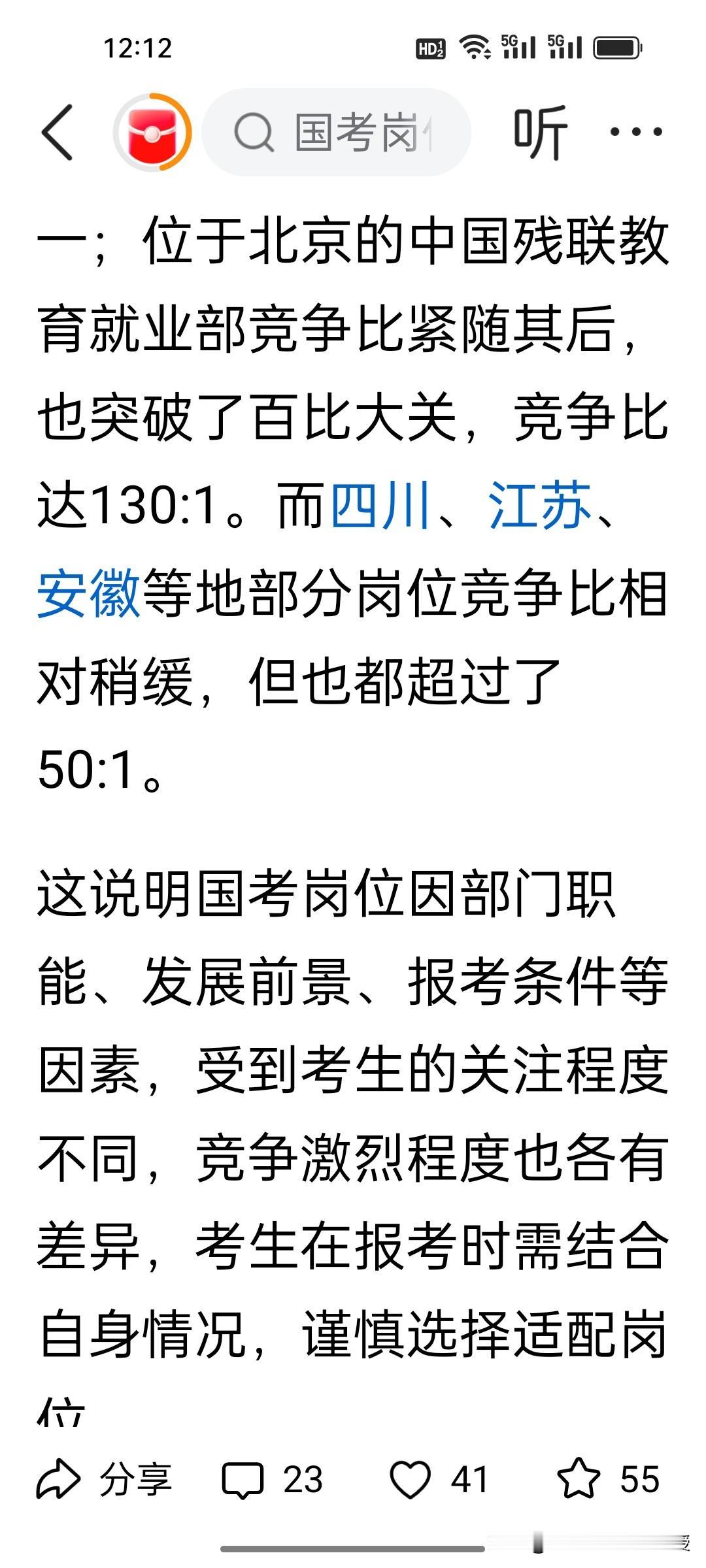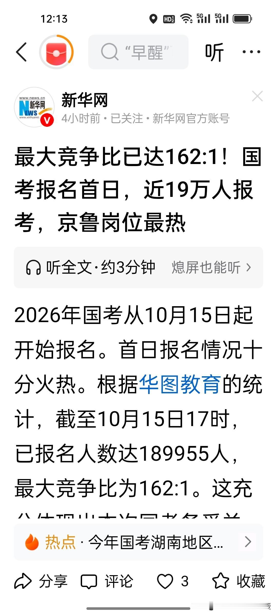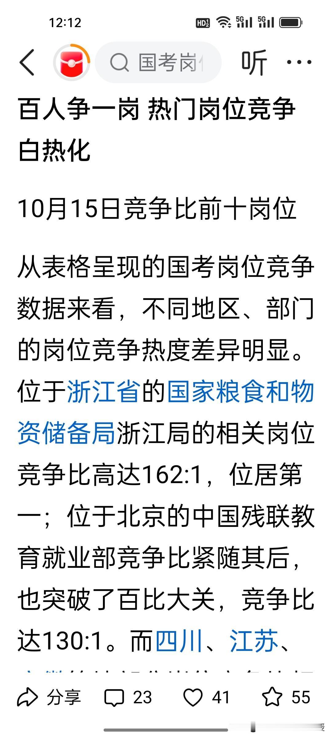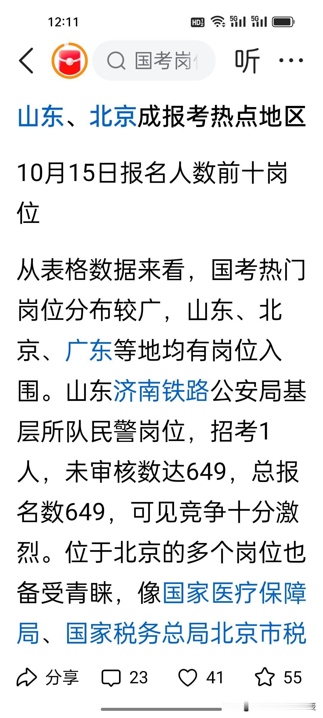 国考报名第一天,竞争激烈到什么程度?山东和北京毫无悬念是最热的报考地区。根据统计数据显示,山东济南铁路公安局基层所队民警岗位,只招考1人,却吸引报名649人,警校毕业生肯定是报考主力,浙江省的国家粮食和物资储备局浙江局的相关岗位竞争比高达162:1,今年由于放宽报考年龄条件,所以今年国考的竞争激烈程度可以说是史上第一。 今年国考可能比高考关注的人还要多,但是今年国考总体招的人数却比去年少一千多人,试卷难度肯定不亚于高考。 国考比高考挤独木桥还难,高考本科录取率在北京本地生都能超过60%,在上海能超过70%,而国考就难多了,这背后折射出青年群体对稳定职业的迫切追求与就业渠道相对不足的现实矛盾。唯有持续拓宽高质量就业赛道、优化就业市场环境,提高薪资待遇,才能让年轻人的职业选择更加从容多元,缓解“千军万马挤公考”的现状。