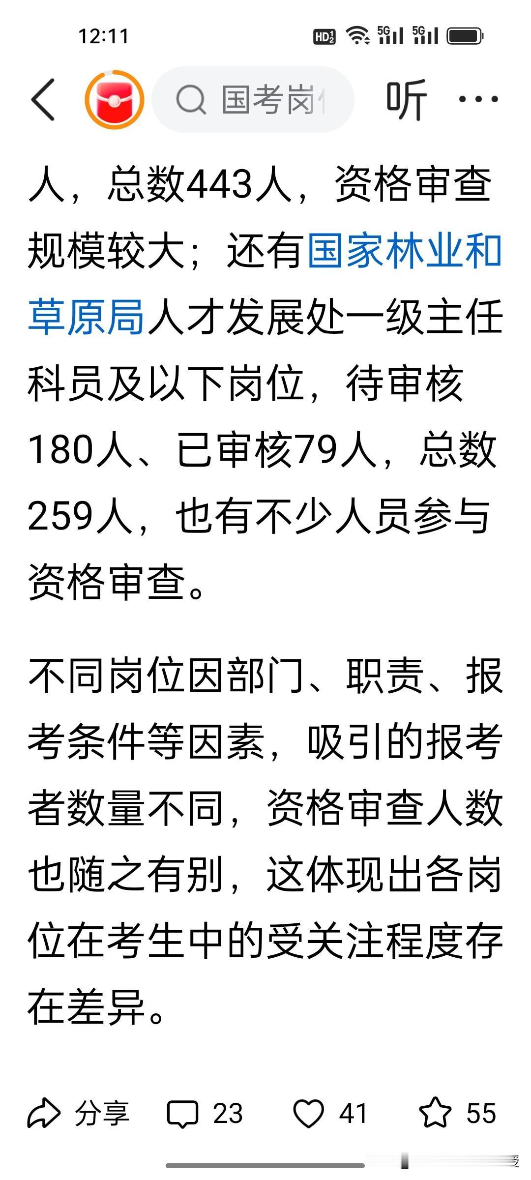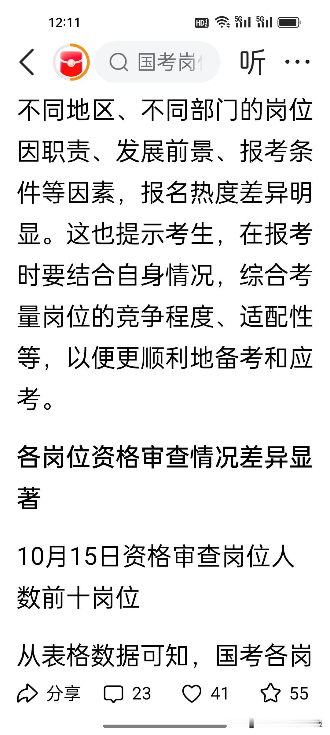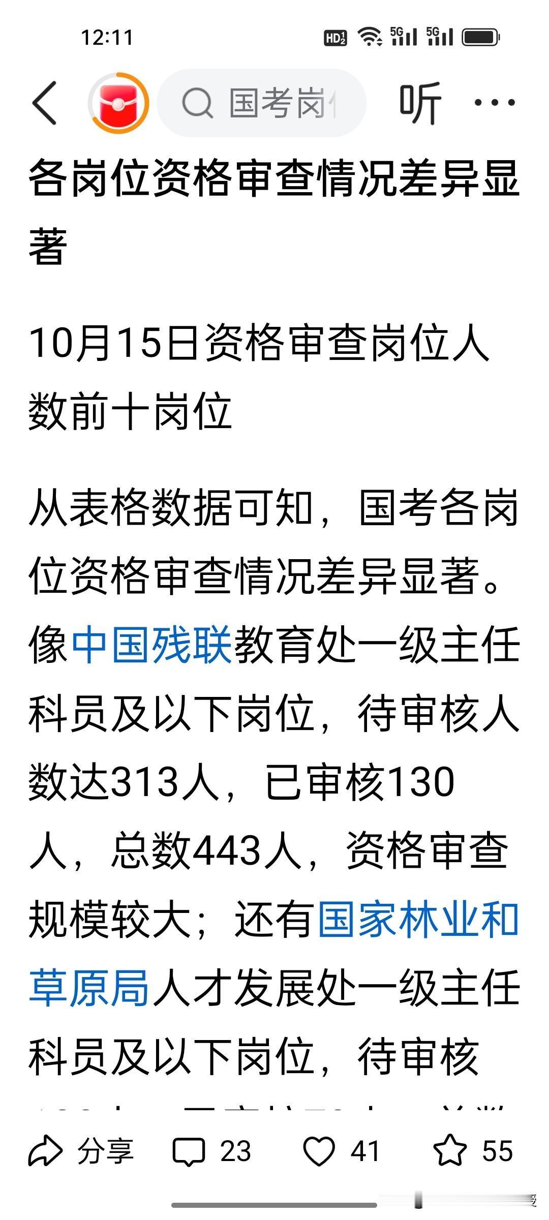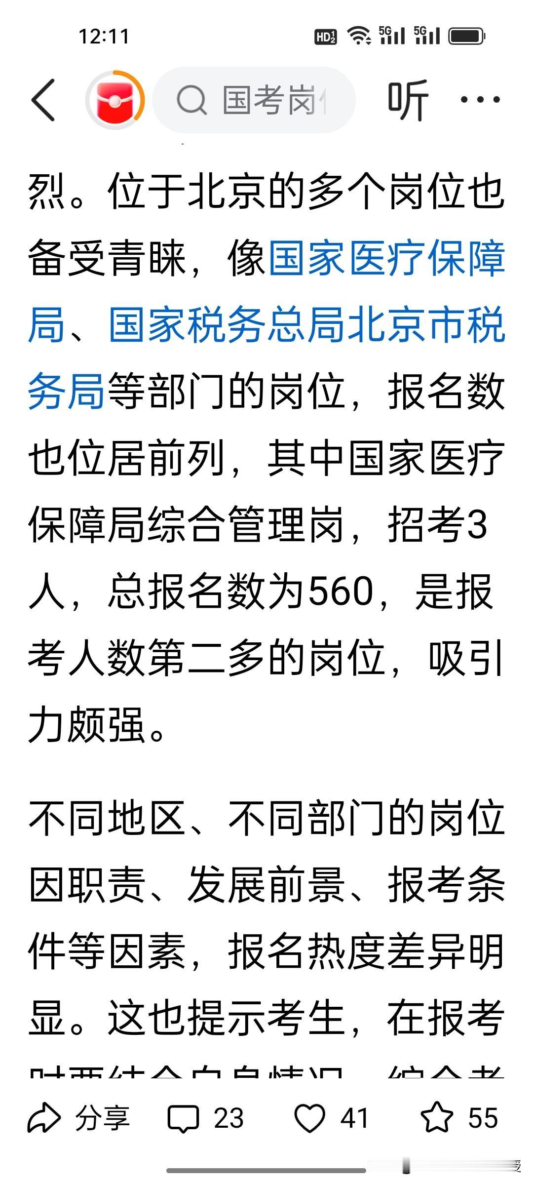 国考报名第一天,竞争激烈到什么程度?山东和北京毫无悬念是最热的报考地区。根据统计数据显示,山东济南铁路公安局基层所队民警岗位,只招考1人,却吸引报名649人,警校毕业生肯定是报考主力,浙江省的国家粮食和物资储备局浙江局的相关岗位竞争比高达162:1,今年由于放宽报考年龄条件,所以今年国考的竞争激烈程度可以说是史上第一。 今年国考可能比高考关注的人还要多,但是今年国考总体招的人数却比去年少一千多人,试卷难度肯定不亚于高考。 国考比高考挤独木桥还难,高考本科录取率在北京本地生都能超过60%,在上海能超过70%,而国考就难多了,这背后折射出青年群体对稳定职业的迫切追求与就业渠道相对不足的现实矛盾。唯有持续拓宽高质量就业赛道、优化就业市场环境,提高薪资待遇,才能让年轻人的职业选择更加从容多元,缓解“千军万马挤公考”的现状。