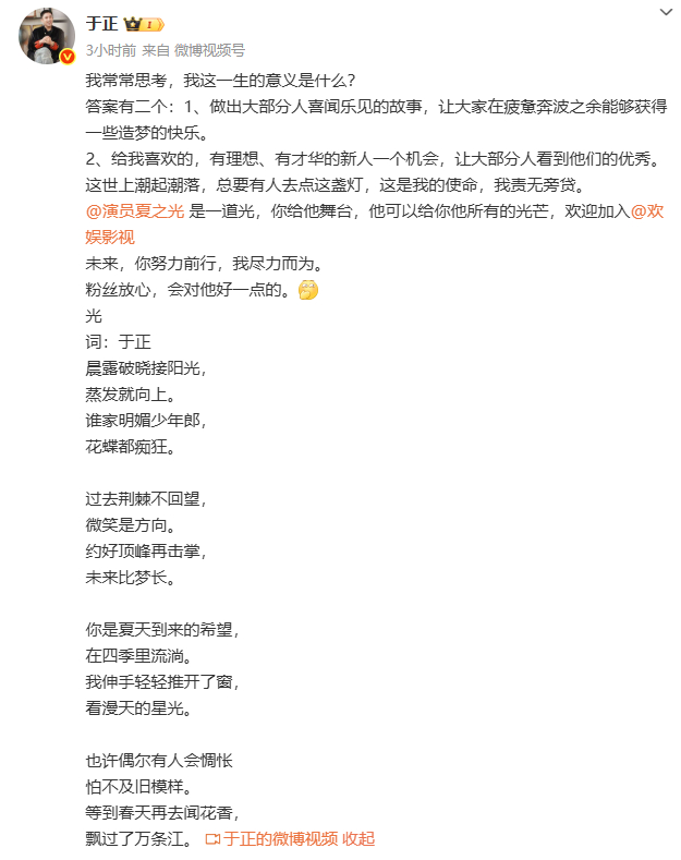 于正给夏之光作诗 官宣夏之光加入了新的大家庭,于正为夏之光作的诗,新团队欢娱影视实力在线,夏之光本身又够努力有潜力,这样的双向奔赴太让人期待了,希望他在影视领域持续发光。