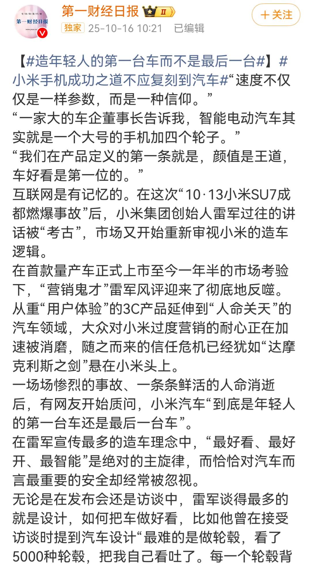 第一财经怎么和小米汽车杠上了[吃瓜群众]“造年轻人的第一台车而不是最后一台”。