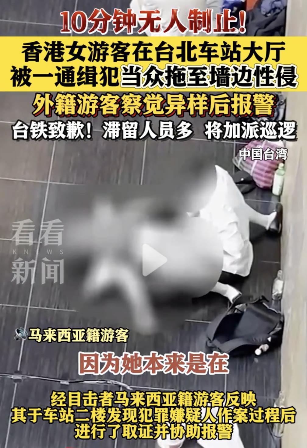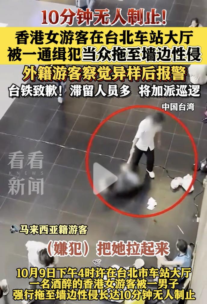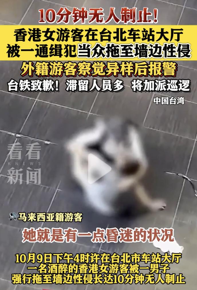 “简直是台湾人的耻辱!” 10月9日下午,台北车站大厅内,一名香港女游客酒醉后侧卧在大厅内地板上,不久一名身穿白色衬衣的男子走向女游客,男子见对方处于昏迷状态,于是准备把女子带走。 男子先是尝试抱起女游客,但没有成功,于是男子直接拽着女游客的一条腿,把女游客拖拽至墙边进行性侵,整个过程持续了10分钟。 要知道,这可是在光天化日之下,而且还是在车站大厅内,周围都是来来往往的人流,就在事发地三四米远的地方,就有一名男子正在候车;周围还有很多摊贩和乘客;车站的服务台距离也只有不足20米,但是却没有一个人上前制止。 最后,一名在二楼的马来西亚籍游客发现情况不对,于是立即用手机拍摄取证,并迅速报警。当车站警方赶到现场时,男子已经实施完犯罪行为准备逃离,最终该男子被抓获。 光天化日,公共场所众目睽睽之下,长达10分钟的时间,竟然没有一个人站出来制止,真是让人匪夷所思,这里的治安究竟有多差?这里的人究竟有多冷漠? 这一刻,是全台湾人的耻辱!
