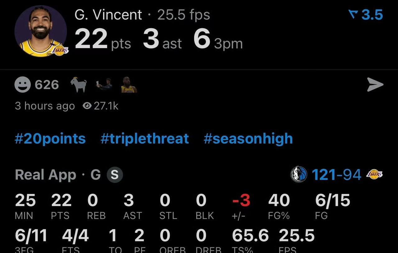 文森特采访:他知道湖人队人手短缺,所以想一开场就展现出强劲的进攻势头,同时他也称赞队友在比赛初期就多次为自己创造出机会。 文森特现在这状态是真敢打!合同年里要是能一直这么猛,下一份合同根本不用等,妥妥的!