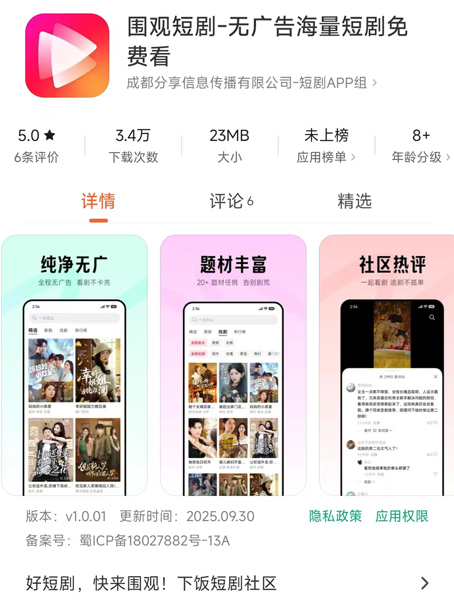 【#小米入局短剧赛道# 】近日,小米手机在其应用商店上架了一款名为“围观短剧”的APP。该APP宣传语为“无广告海量短剧免费看”,目前下载量已达3.4万。